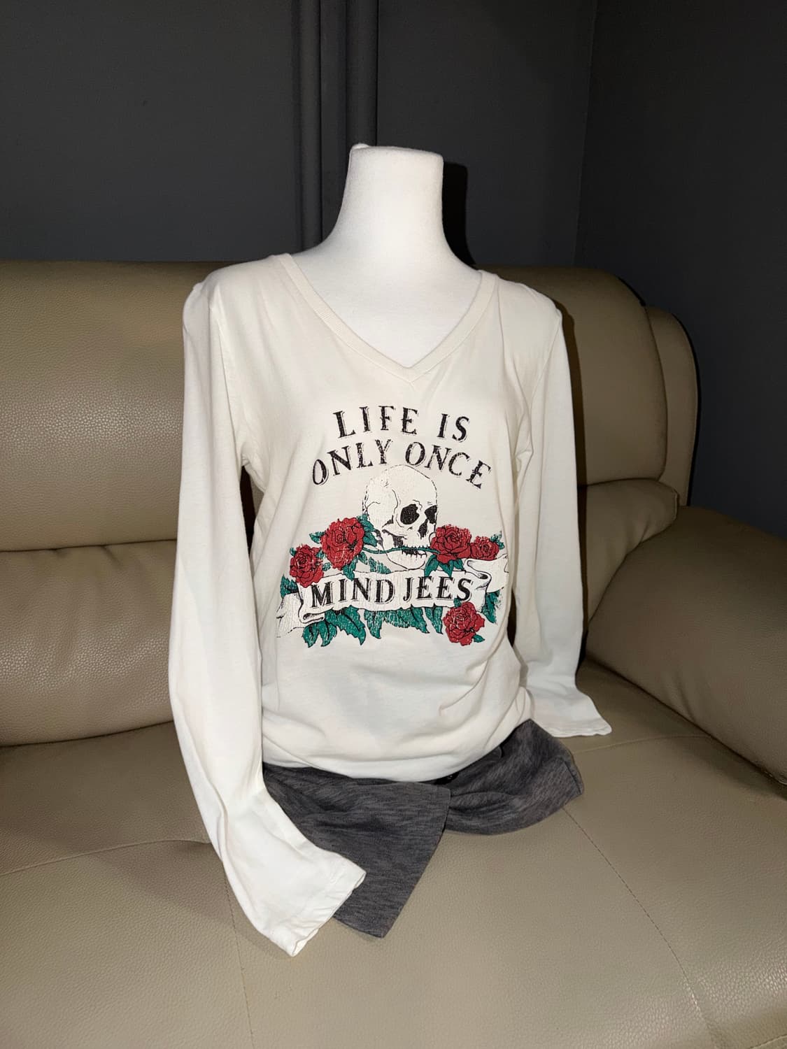 •skull printing v-neck long sleeve •size: cm 47 67 62(가슴 총장 팔) •price: 28000 -화이트 컬러에 스컬 프린팅 디테일 롱슬리브 -브이넥 디자인으로 넥라인 아주 시원해보이구 핏감도 아주 우수했던! -아주 얇은 소재감이라 블랙 이너 착용시 비침 있았어용 -소매 오염, 프린팅 사용감으로 저렴하게 ..🥲