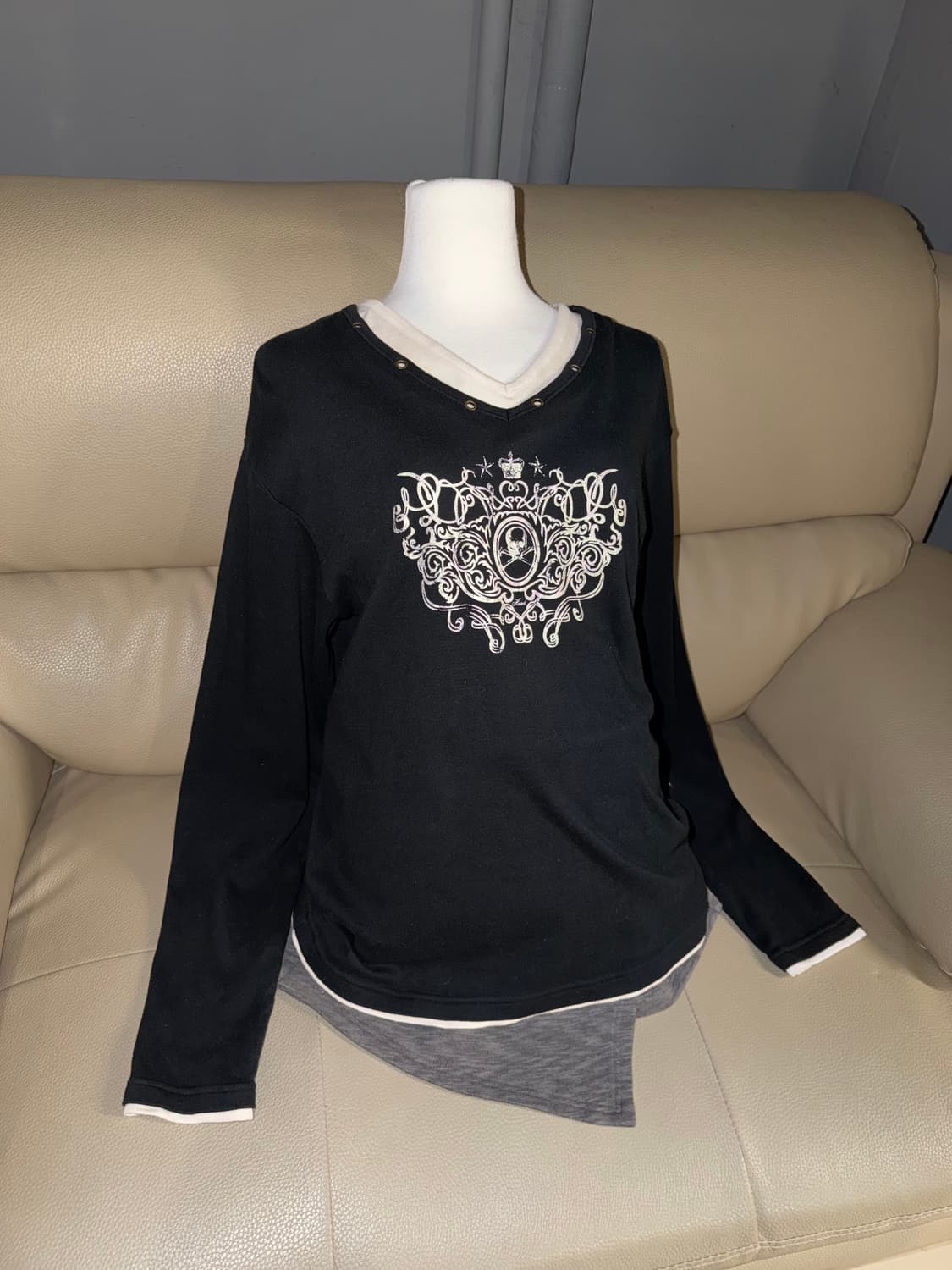 •layered detail punk printing long sleeve •size: cm 53 65 70(가슴 총장 팔) •price: 38000 -레이어드 디자인의 펑크 프린팅 디테일 롱슬리브 -전면부 & 후면부 모두 레터링 & 프린팅 들어갔으며 소매와 밑단에도 레이어드 된 디테일 보이는게 참 예쁩니다 ㅎㅎ -소재감 말랑 쫀쫀해서 핏감두 아주 좋구옹 팔이 참 길어여 -넥라인 레이어드 된 부분이 미세하게 누런감 있어서 사진 첨부 햇습니다 착용시 그리 거슬리지 않았어요! / 미세 핀홀