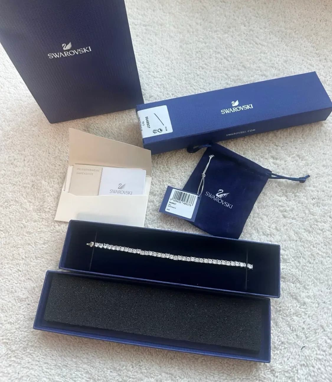 스와로브스키 테니스 팔찌 풀박스 새상품입니다. 보증서, 케이스, 쇼핑백, 더스트백 모두 포함입니다. ㄱㅈ하시면 배송비 빼드려요!