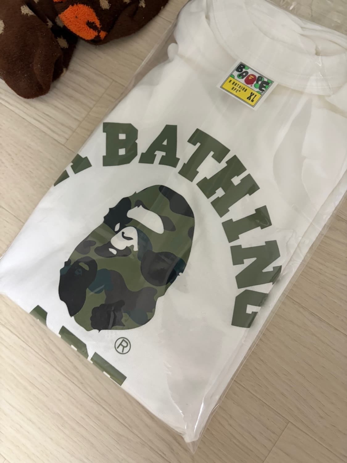 베이프 흰색 티셔츠 XL 새상품입니다 3/21 후쿠오카 텐진 베이프 매장 구매 시착 해보니 사이즈 좀 작아서 팝니다ㅠㅠ 가슴단면 54cm 기장 70cm 정도 쇼핑백도 있어요