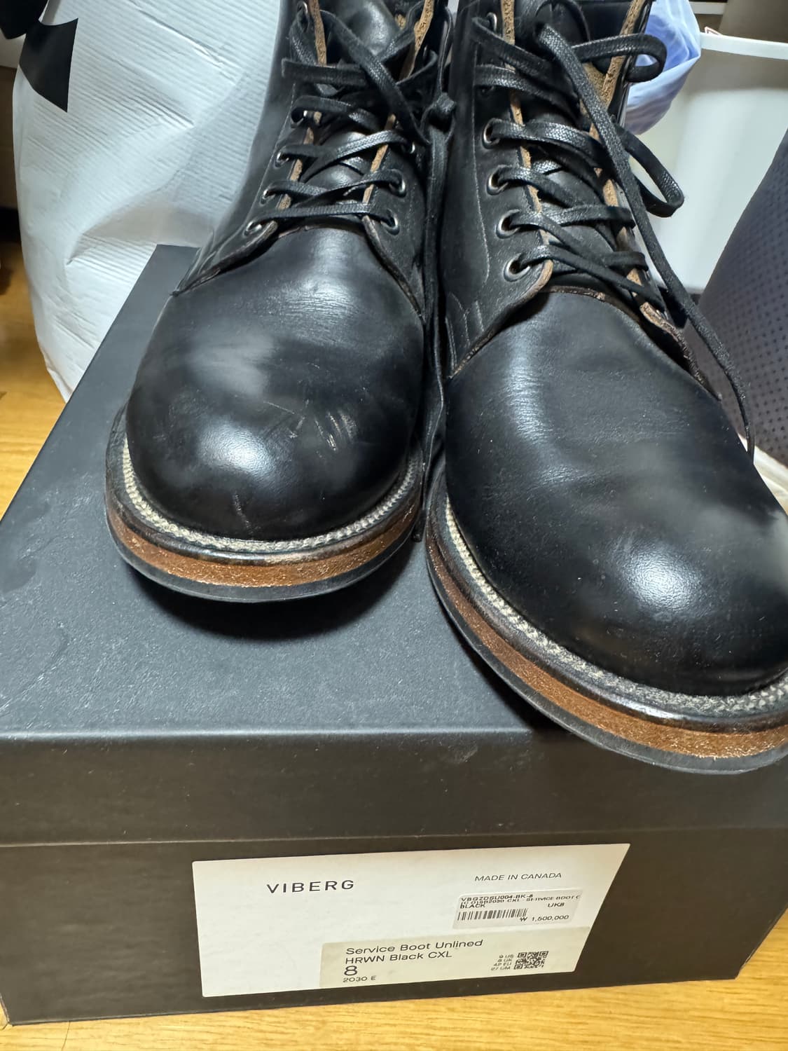 바이버그. 서비스부츠 언라인드 HRWN 블랙 크롬악셀 작년 더헌대 스컬프스토어 구매. 원래 무릎이 좀 안좋아서 부츠류. 안신는 신발류를 정리중입니다. 실착용 횟수는 10회 미만. 오른쪽 앞코 찍힘은 케어할땐 보이지 않습니다. 집에서 홈케어도 두달에 한번은 진행해놓았습니다.