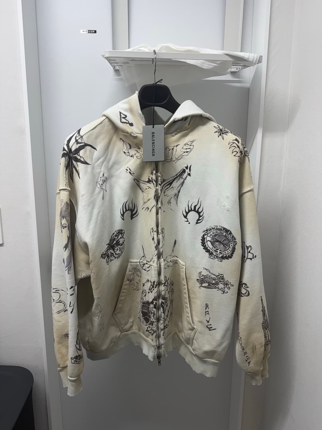발렌시아가 24ss 타투 후드집업입니다. 24ss 시즌 메인 중 하나였으며 크게 나온 제품이 아니라 큰 사이즈가 귀했습니다. 더티워싱과 타투 그래픽이 잘 어우러진 옷입니다. 커피가 튄 자국이 있으나 애초에 더티워싱 제품이라 그냥 입었습니다. 국내매장 제품이며 택과 옷 구성입니다.
