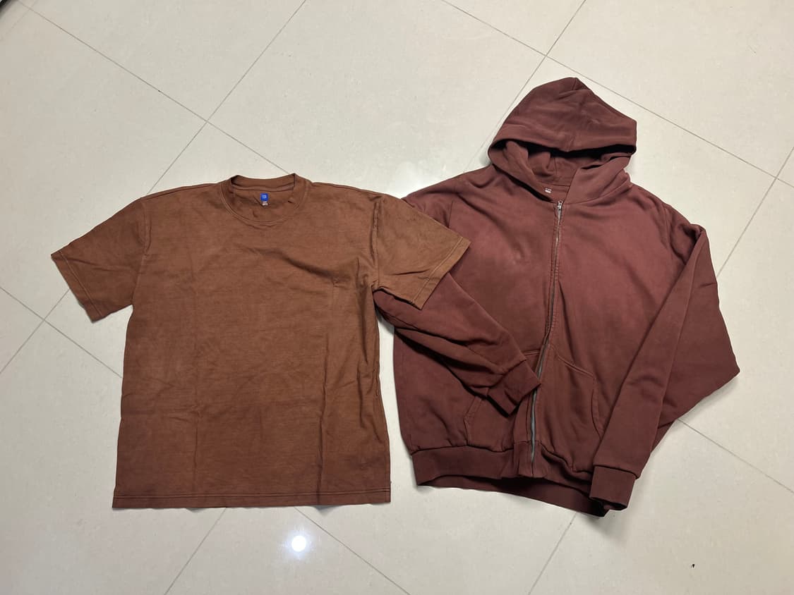반팔 L, 후드집업 XXL 이구요 전에 갈색에 꽃혀서 만들었는데 막상 입지 않아 이사 정리하며 판매합니다! 반팔 5 후드집업 10 염색한거라 부분부분 물빠짐 자국 있고 이염 사진 참고! 상태 사진 확인, 쿨거시 택포 가능, 구매 후 환불 X