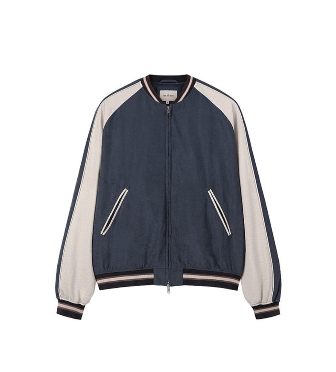 안녕하세요! 아트이프액츠 수베니어 자켓 M사이즈입니다. 네이비 색상 몸통에 흰색 팔이 포인트인 제품입니다. 얇은 소재라 간절기에 입기 좋습니다. 구매후 실착 1회 했습니다!