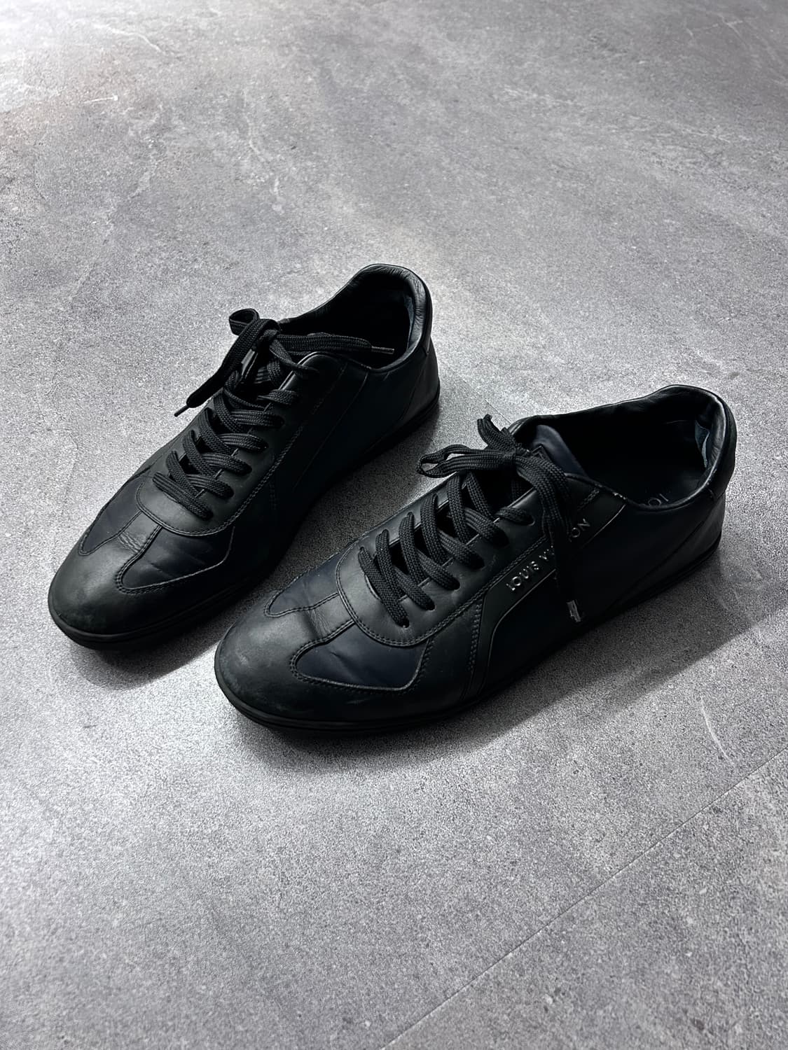 Louis Vuitton Low Leather Sneakers *Price 18.0 미니멀한 로우탑 실루엣 위에 루이비통 특유의 절제된 럭셔리 감도가 담긴 스니커즈 과도한 장식 없이 사이드에 각인된 로고와 패널 구조만으로 아이덴티티를 드러내며, 매끈한 블랙 레더와 자연스러운 사용감이 더해져 오히려 아카이브적인 무드를 형성하는 개체 둥글게 떨어지는 토쉐입과 낮은 솔 구조로 팬츠와 자연스럽게 이어지며, 슬림한 데님부터 와이드 팬츠까지 폭넓게 매칭 가능한 제품립니다 *Size US 6.5 *Condition 7/10 Instagram followers get 10% off