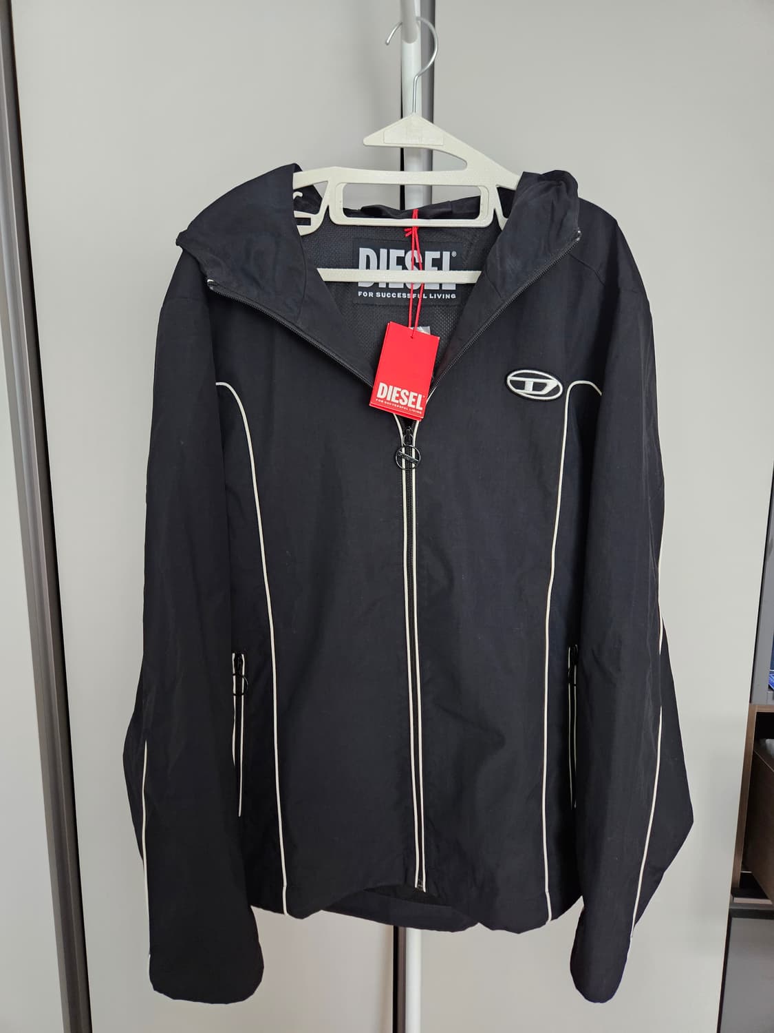 디젤 J-Hives 블랙 바람막이 L 사이즈입니다 가볍고 활동성이 좋은 바람막이입니다 후드 자켓 스타일로, 간절기에 유용하게 입을 수 있습니다. 택채 새상품입니다