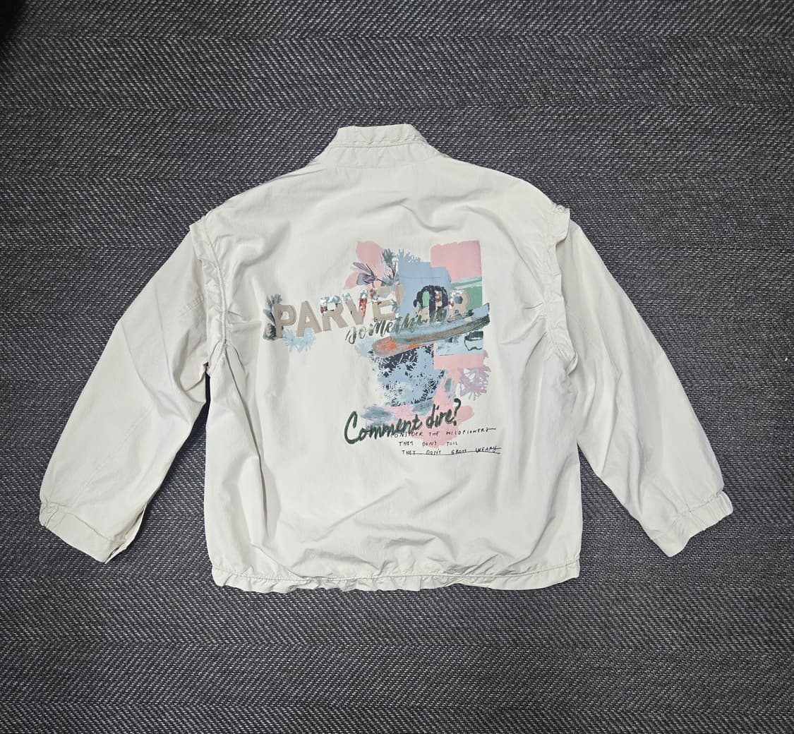 아이보리 색상의 지컷 자켓 점퍼입니다. 등판에 포인트가 들어간 디자인이 눈에 띄네요. 얇은 소재라 지금 날씨에 가볍게 걸치기 좋습니다. 문의 없으시면 바로 안전결제해주시면 됩니다! ♡상세 사진에 실측 있습니다. ♡사이즈의 측정 방법에 따라 1~4cm 차이가 있을 수 있습니다. ♡모니터 및 휴대폰의 해상도에 따라 상품의 실제 색상과 다소 차이가 있을 수 있습니다. ♡핸드폰 카메라와 조명을 사용하여 찰영하기에 어두운컬러가 밝게 나오는 경향이 있어 물빠짐 또는 얼룩 처럼 보일 수 있습니다. ♡중고제품 특성상 화면에 나타나지 않는 미세한오염,데미지,세월의흔적으로인한 사용감이 있으니 참고부탁드립니다. ♡구성품 없습니다. ♡환불 반품 불가입니다. ♡흥정안합니다. ♡제주도 추가요금 3000원있습니다. ♡도서산지역택배발송안됩니다.