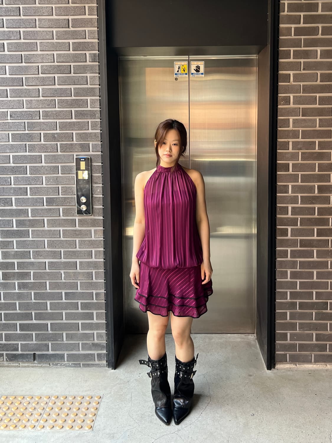 Scot Club Halter Neck Dress -일본 브랜드. Since 1982 -가슴 61 총장 98 cm -폴리에스터 100 % -후면 스톤 버튼, 리본 디테일 -이너스커트, 이너 탑 내장 아주 가볍고 시원한 원단으로 편안한 착용감인 홀터넥 드레스입니다. 밑단에는 블랙 컬러의 트리밍으로 마무리되어 세련된 무드의 디자인입니다. 허리에 밴딩 처리되어 있어 편안한 착용감이며 이너 탑과 스커트가 일체형으로 내장되어 있습니다. Condition -눈에 띄는 사용감 없이 깔끔한 컨디션