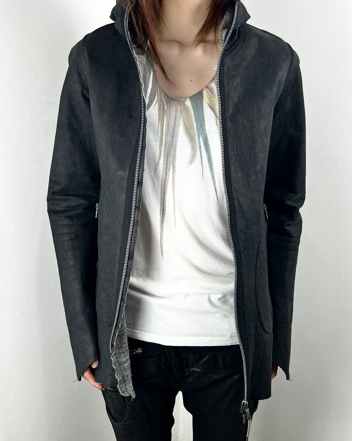아이작 세럼 2002년 파리에서 자신의 브랜드인 아이작 셀럼 익스피리언스를 설립했습니다.아이작 세럼은 산업적 리벳 장식과 외부 스티칭 디테일, 소재 본연의 특성을 살려 럭셔리와 거친 느낌을 동시에 담은 브루탈리즘 스타일, 유기적인 흐름의 곡선 패턴을 이용한 특유의 실루엣으로 이야기합니다. 인위적인 가공이 들어가지 않아 오래된 듯 보이며 가죽 본래의 질감이 노출된 상태의 램스킨 하이넥 후드 레더 자켓입니다. 인체공학적 패턴으로 몸을 감싸는 슬림한 실루엣이 큰 특징이며, 외부로 노출된 스티치 디테일과 내부 리플렉티브 테이프 심실링 마감, 프론트 포켓에 두개의 메탈 리벳 디테일이 있습니다. 소매와 밑단은 정교한 비대칭 로우컷 마감입니다. 내부에 울/코튼 블렌드 소재의 얇은 라이너가 붙어있습니다. Condition: AB Model: 172cm/48kg