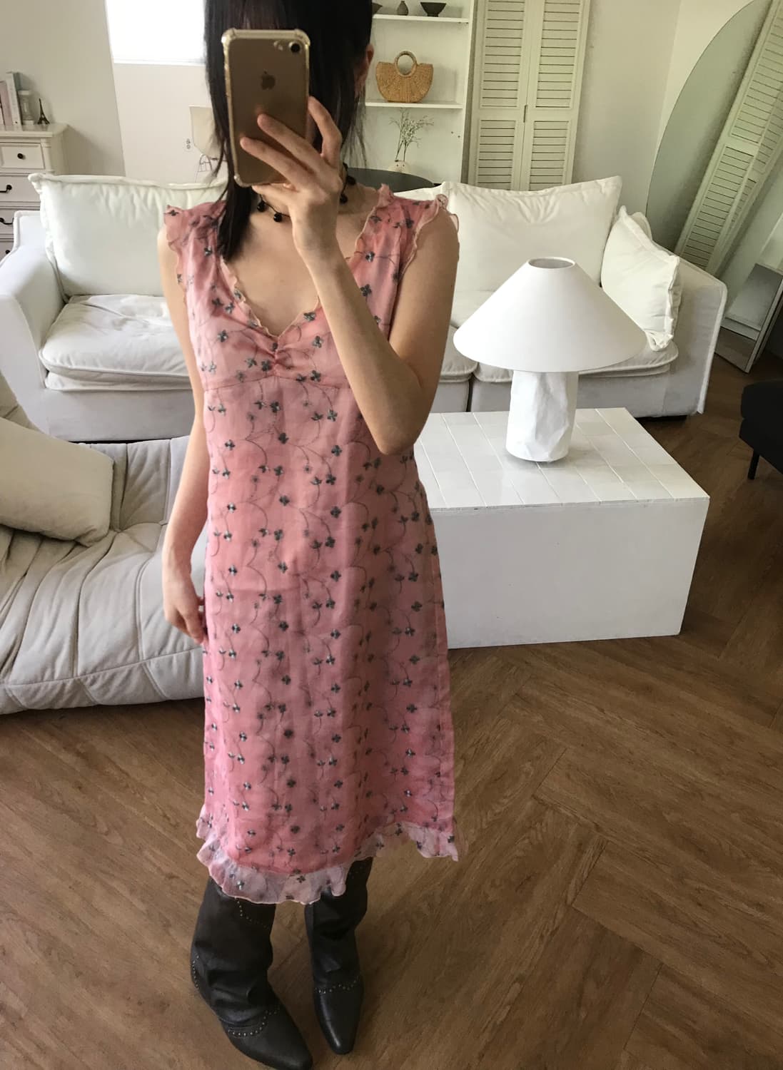 잔잔한 플로럴 펄 자수 패턴이 더해진 원피스입니다. 넥라인과 소매 라인에 더해진 프릴 디테일이 은은한 포인트가 되어주며, 바디라인을 따라 자연스럽게 떨어지는 핏입니다.