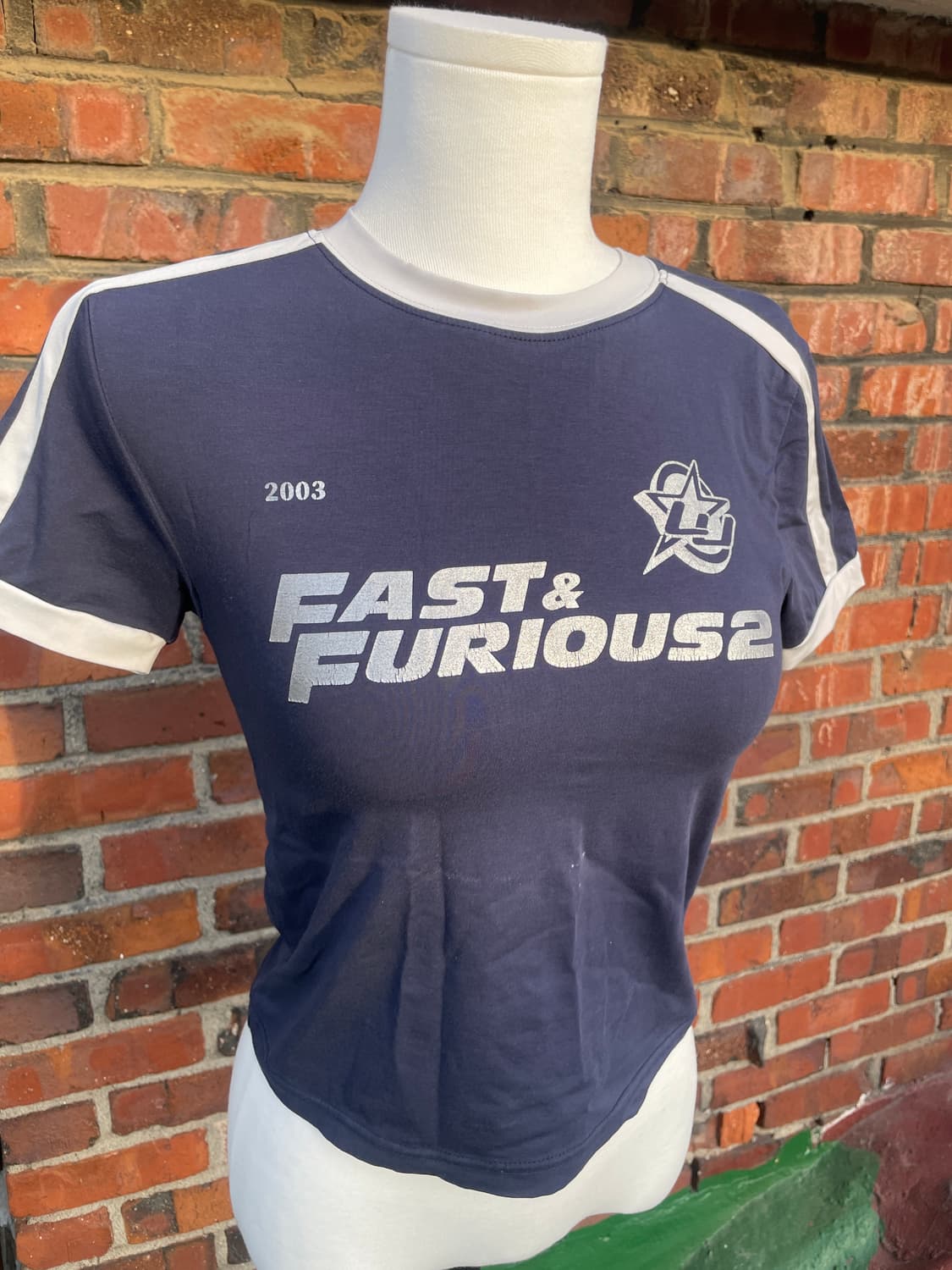 스포티한 느낌의 핏한 티셔츠입니다 통 넓은 바지에 매치하면 예뻐요