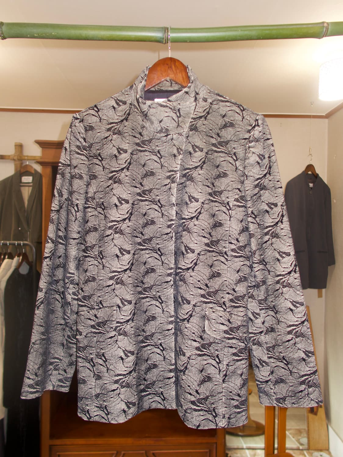 cotton 97 , nylon 2 , poly 1 lining rayan 100 스탠드 하이넥 벨벳 , 플라워 자가드 사진보다 실제 좀더 어두운 컬러 히든버튼 size 40 shoulder 42cm chest 48cm sleeve 62cm length 68cm