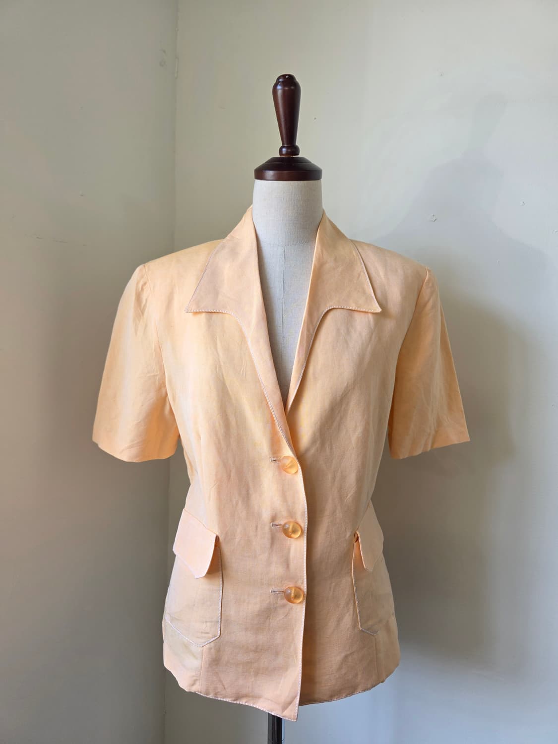 이태리에서 제작된 반팔 자켓입니다. 은은한 살구색 컬러가 고급스러워요. 소재 너무 좋고, 핏도 이쁩니다. 어깨단면41/가슴단면50/총장61 아세테이트63, 큐프라37 ⚘️사진의 경우 날씨나 조명, 각도 등에 따라 색상이 다르게 보일 수 있습니다. ⚘️사이즈는 단면으로 측정되며 측정 방법, 위치 및 재는 사람에 따라 1~3cm 정도의 오차가 발생할 수 있습니다. 그로 인한 교환, 환불은 되지 않으니 참고해주세요. 5만원 이상 구매 시 무배 교환, 환불❌️