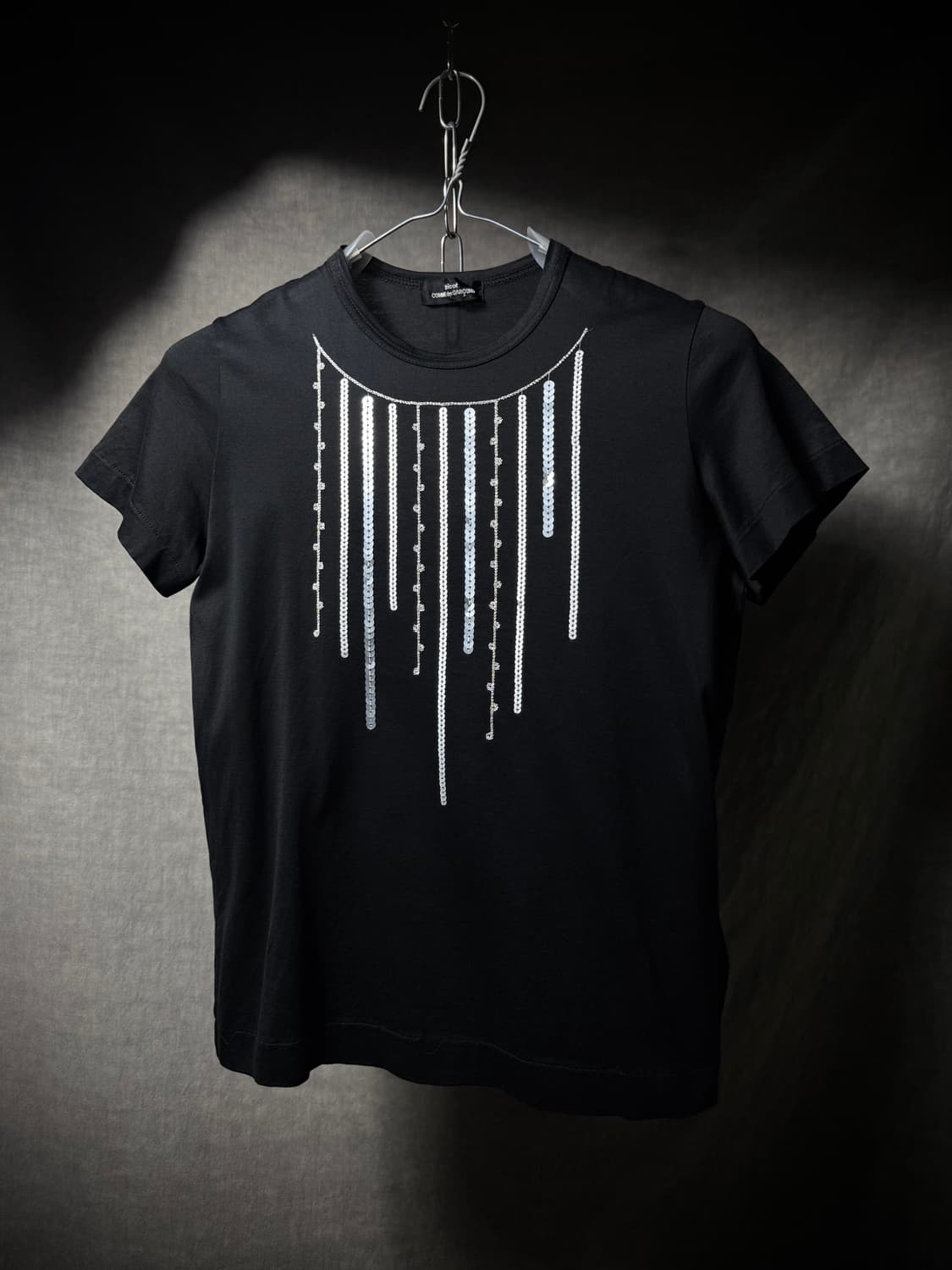 07AW 꼼데가르송 트리코 목걸이 반팔 티셔츠 네크라인을 따라 수직으로 떨어지는 실버 시퀸 디테일이 특징인 피스입니다. 매트한 코튼 바디와 시퀸의 질감 대비가 돋보이는 제품입니다 Condition: A (하단부 실풀림 존재) Size: OS Shoulder/Chest/Sleeve/Length: 35/41/15/55cm Fabric: Cotton 100%
