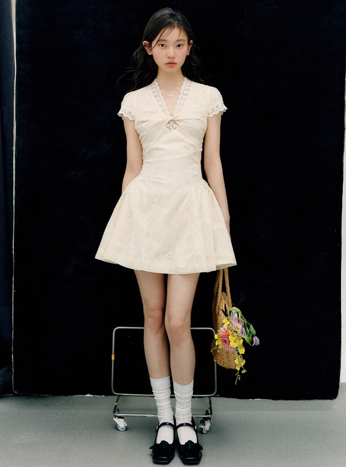 해외배송으로 주문해서 오늘 받은 상품입니다. 생각보다 너무 안 어울려서 반품할까 고민하다 해외배송이라 머리아파서 그냥 여기 올립니다! 텍 제거 안 한 새 상품이에요. 치마 기장은 짧은 편이고, 160 48키로 기준 흉통이 좀 낍니다. 엄청 마르신분들 예쁘게 입을 듯 해요. 소재는 겉감 면 100, 안감 폴리 100입니다.