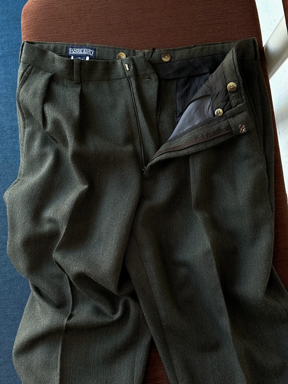 「LANDS' END」   U.S.A. made light wool tweed trouser  • Made In U.S.A.  • 부드러우면서 가볍게 흐르는 우아한 재질감  • 답답함 없는 소재감의 통통한 표면감  • 은은한 디자인 패턴의 유니크한 분위기  • 투턱 사양의 여유있는 와이드 테이퍼드 실루엣  • 톤 다운된 느낌의 유니크한 차분한 컬러  Color | Olive green  Fabric | 울 100%  Size | 35  허리 | 43.5 cm  밑위 | 36 cm  허벅지 | 36.5 cm  총장 | 100.5 cm  밑단 | 23 cm  Model | 174 cm 63 kg