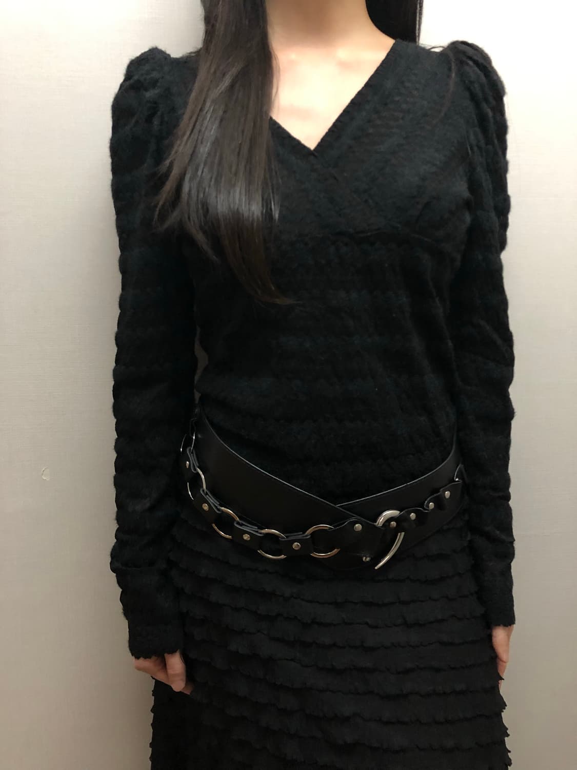 black shirring knit Price : 2.8 - 미니멀한 무드의 블랙 컬러의 니트입니다. • 가슴 단면 44 • 총장 55