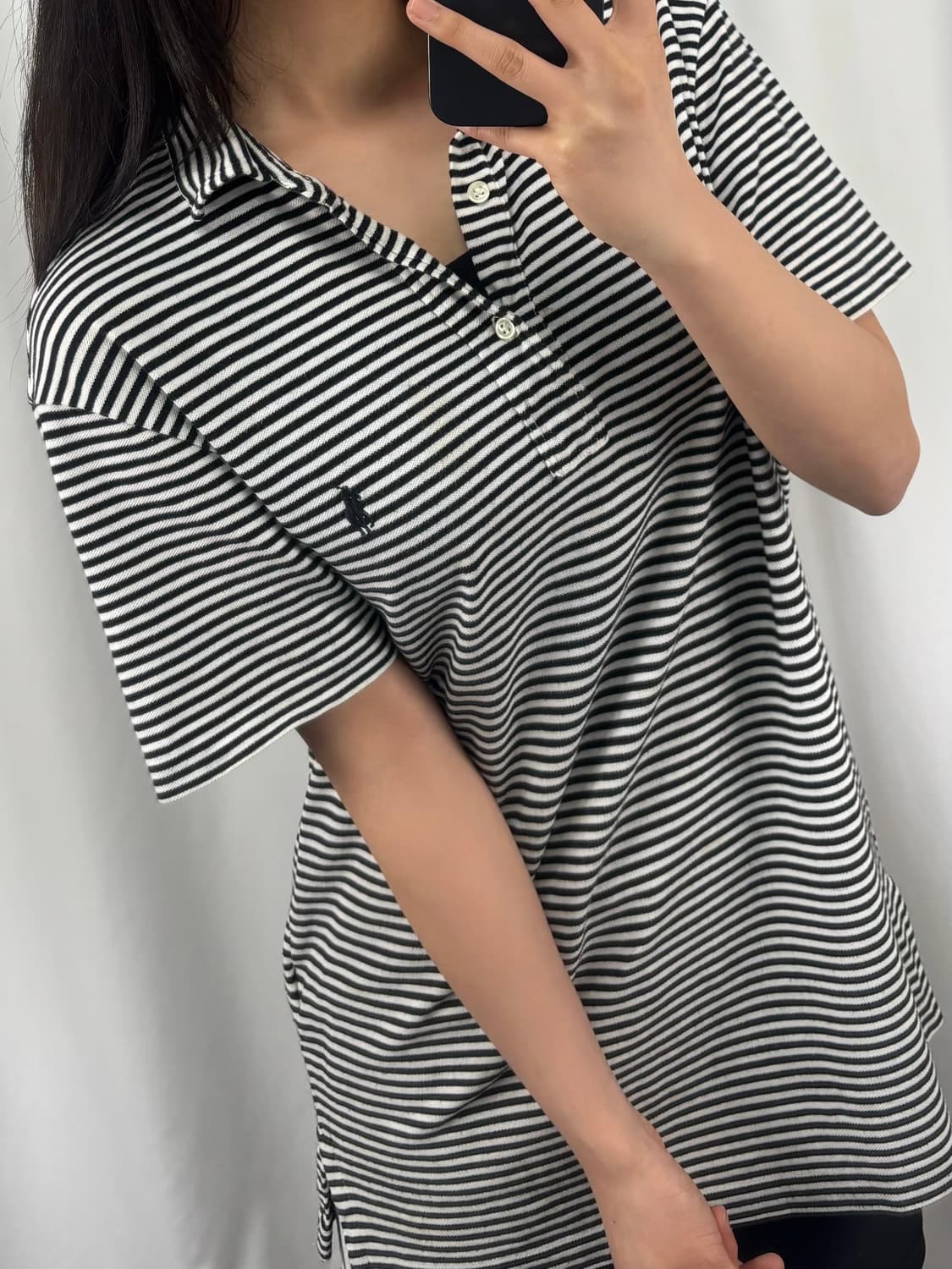 Polo • 𝐬𝐢𝐳𝐞: S - 가슴 53 총장 71 • 𝐦𝐨𝐝𝐞𝐥: 158/44size * 폴로 스트라이프 PK 반팔입니다. featherweight mesh 소재로 가볍고 시원하며 데일리로 착용 가능한 제품입니다.