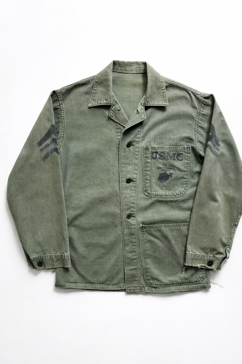 실측 어깨 48.5cm 가슴 53.5cm 소매 56.5cm 총 기장 70cm 40년대 2차 세계대전 발 미 해병대 P-41 HBT 유틸리티 자켓입니다. 초어자켓의 근간이 되는 디자인 형태, 상징적인 USMC 스텐실과 각인 리벳. 40년대의 Olive Drab 컬러에서 세월에 의한 자연스러운 워싱감과 선 페이딩이 어우러진 매력적인 한 점. 체감 국내 100 호 정도. 우측 포켓 하나가 없는 2 포켓의 개체입니다. 커프 부분의 헤짐 외 크티티컬한 하자 내역 없는 유즈드 컨디션입니다.