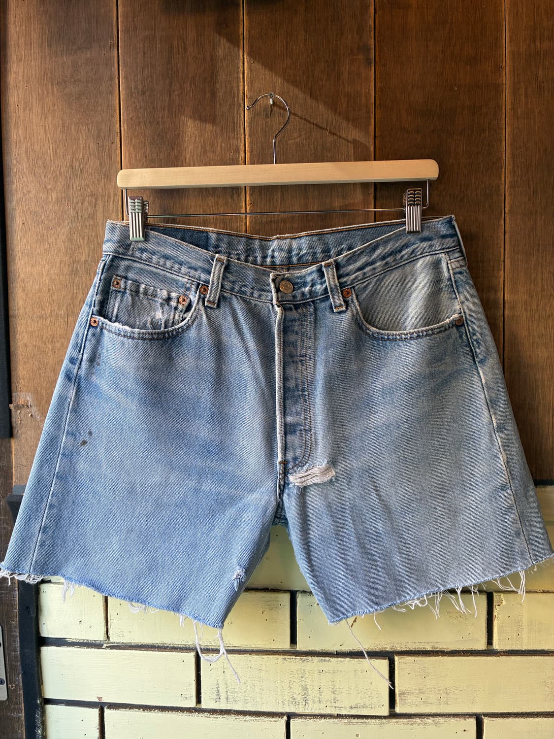90’s Levi’s 501 Light Blue Denim Shorts Cut-off Levi’s 501 데님 커스텀 컷팅된 쇼츠입니다. 라이트 블루 워싱에 자연스럽게 바랜 페이딩과 데미지가 더해져 빈티지한 무드가 잘 담긴 개체입니다. 501 특유의 스트레이트 핏으로 과하지 않게 여유있는 실루엣 입니다. 버튼플라이 디테일 ,프론트 포켓 및 허벅지 부분 자연스러운 디스트로이드, 컷오프된 밑단까지 전체적으로 밸런스 좋게 에이징된 상태입니다. ✔️ Levi’s 501 오리지널 핏 ✔️ 버튼플라이 ✔️ 라이트 블루 워싱 & 자연스러운 페이딩 ✔️ 컷오프 쇼츠 -size 실측(cm) 허리단면 39 (30~31inch) 밑위 25 허벅지 32 밑단 28 총장 40 실측사이즈는 1-2cm 오차가 있을수 있습니다! 전체적인 컨디션 확인 부탁드립니다 ! 빈티지 제품 특성상 세월의 흔적으로 인한 오염이나 데미지 있음을 참고 부탁드립니다. 특정 오염과 데미지는 최대한 체크하여 상세사진으로 안내해 드립니다. 저희가 미쳐 발견하지 못한 오염이나 하자가 있을수 있습니다. 그로 인한 교환이나 환불은 불가한점 미리 양해부탁드립니다 .