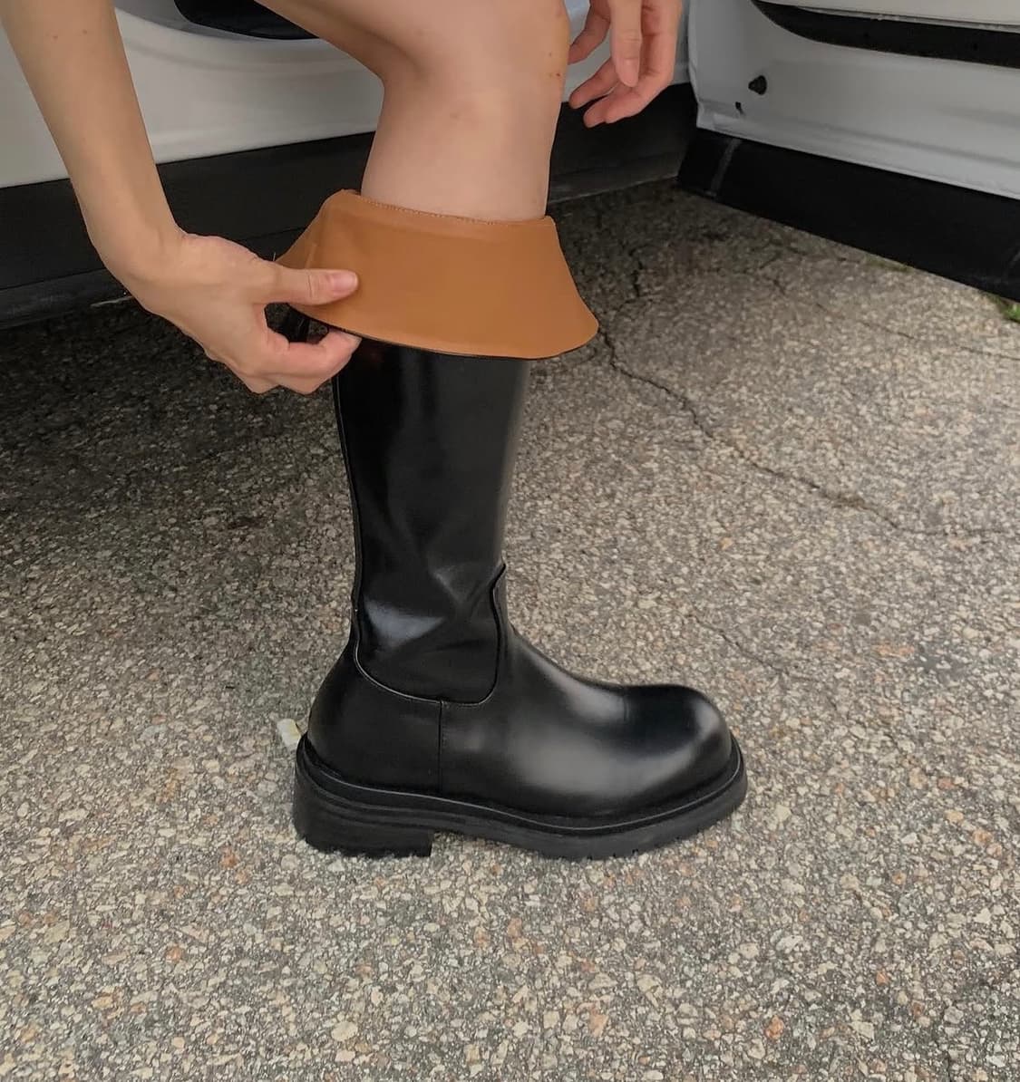 볼드한 스타일의 롱부츠입니다 그냥 블랙 롱부츠인데 접어입으면 브라운이 보여서 더 예뻐요 1회 착용 상태 좋아요