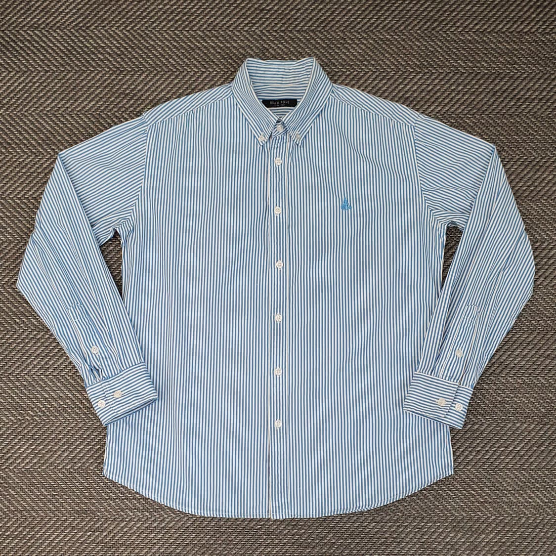 어깨 47 단면 56 총기장 70 하늘색 스트라이프 긴소매 셔츠이에요. 옷이 작게나와서 슬림핏이구 카라접히는 부위에 약간 착용감 존재하나 착용하시면 티 안나요. 다른옷이랑 같이 구매시 배송비 무료 중고O 새옷X