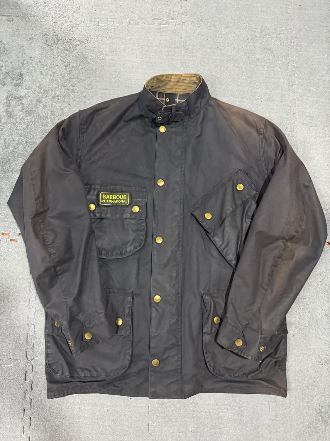 바버 인터네셔널 A7 왁스 자켓 (C42 / 105~110) 영국 Barbour 인터네셔널 빈티지 제품입니다.90년대 후반~2000년 초반 Made in England, 3크라운 라벨 적용된 모델입니다. 사이즈: C42 (국내 105~110) 색상: 블랙 구성: 자켓 단품 (벨트 없음) 상태: 사용감 및 자연스러운 페이딩 있음 (사진 참고) 요즘 나오는 인터네셔널과 다르게당시 라이딩용으로 제작된 모델이라 원단이 두껍고실루엣도 더 투박한 “빈티지 감성”이 강한 제품입니다. 특히 내부 안감은 드레스 고든(Dress Gordon) 타탄 체크 적용된 구형 타입으로 현재는 사용되지 않는 빈티지 디테일입니다. 최근 빈티지 바버 수요 증가로 상태 좋은 개체는 점점 빠르게 소진되는 추세이며특히 C42 사이즈는 가장 수요 많은 사이즈입니다 인터네셔널 특유의 4포켓, 브라스 버튼 디테일 그대로 살아있고실사용 + 빈티지 분위기 모두 좋은 개체입니다. 이체 거래만 네고 가능
