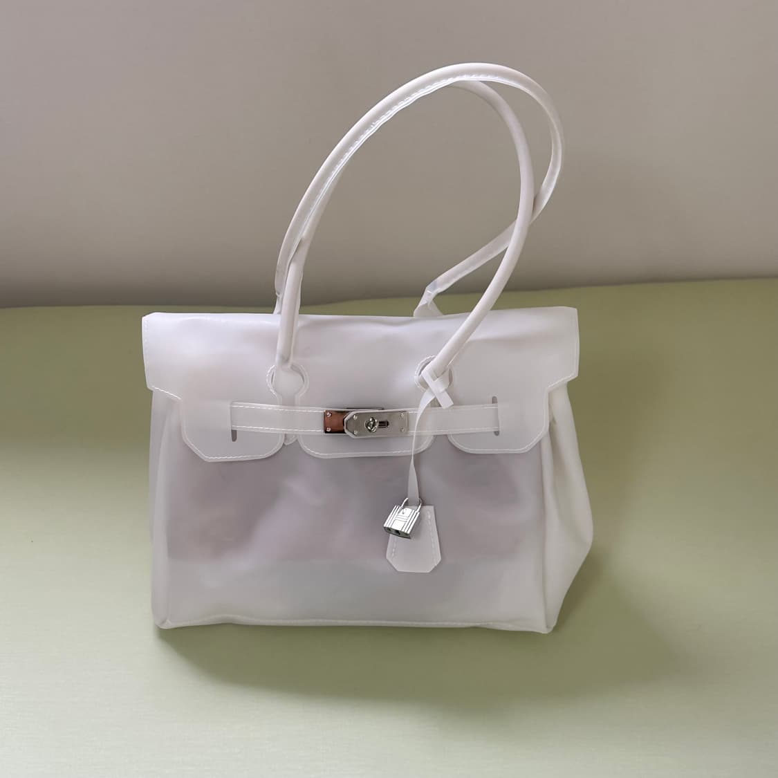 화이트 투명 젤리 버킨백 반투명감(사진 속 손가락 비침 정도 확인해 주세요) (가방 안에 보충제 들어있는 것도 비침 정도 봐주세요!) 가로 29 세로 21 B급 새상품 입니다. 사진 잘 확인해주시고 b급이기때문에 예민한분들은 피해주세요..!