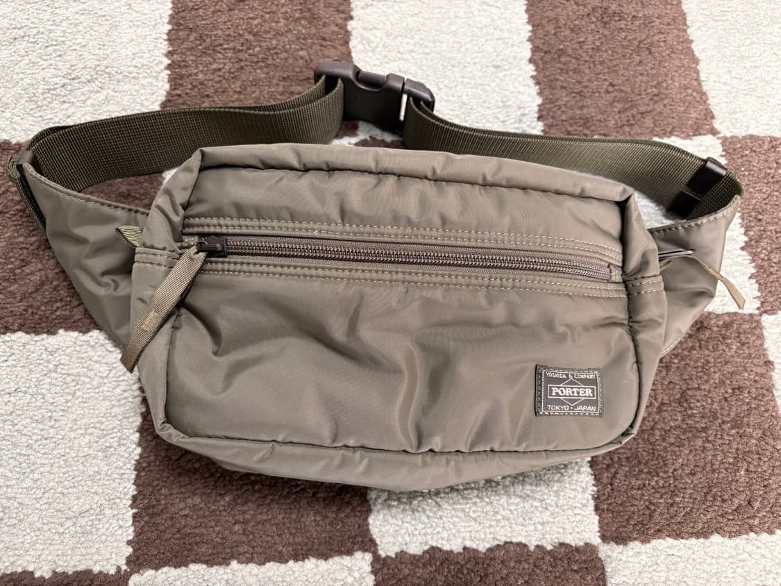 헤드포터 올리브드랩 힙색 탱커보다 매트하고 단단한 나일론 소재의 겉감 눈에 띄는 하자는 없이 상태 양호합니다. 사이즈 참고용 실측 23*13*9 (cm)
