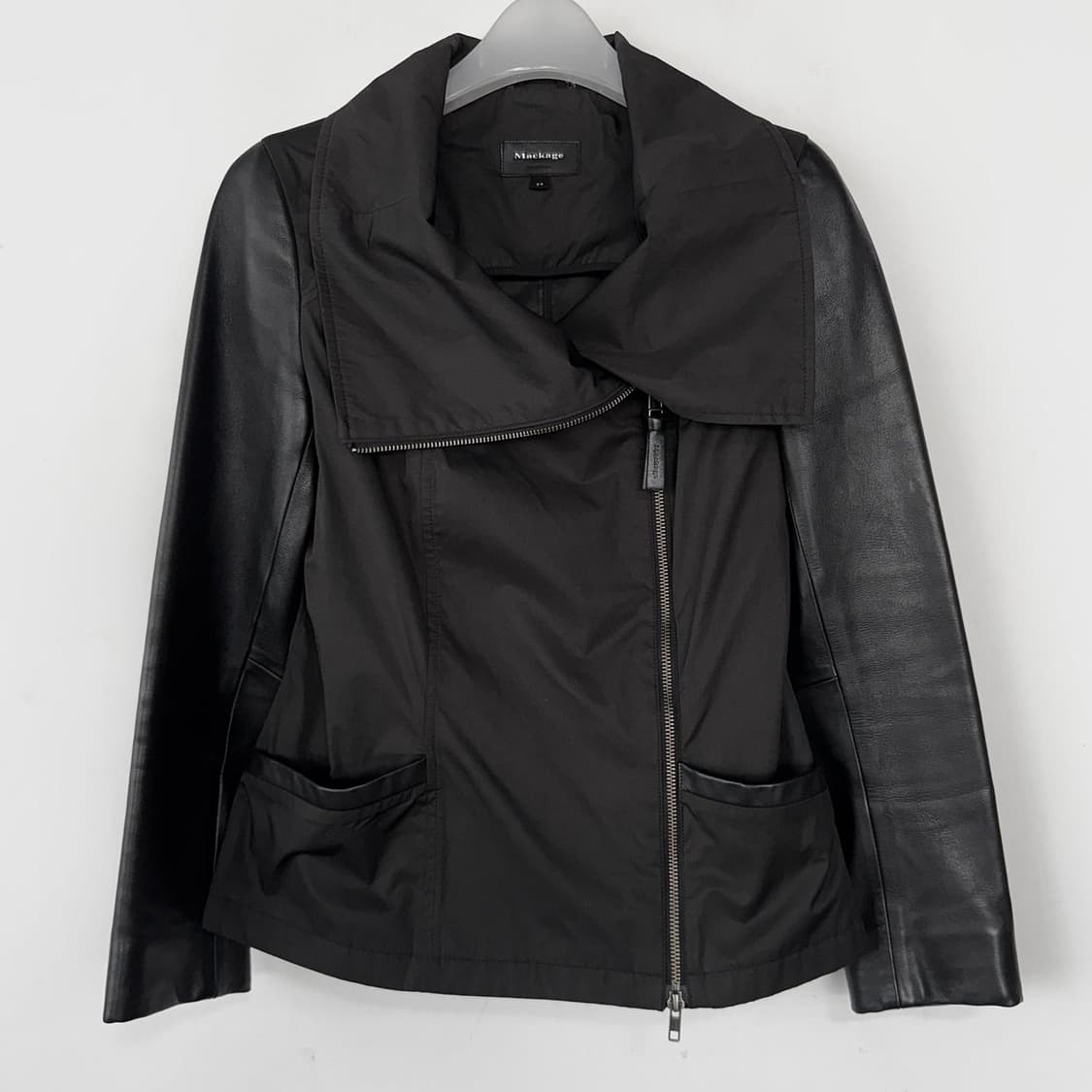 시크한 매력의 맥케이지 가죽 배색 자켓이에요. 지퍼를 오픈해 와이드 칼라 디자인으로도, 하이넥으로도 연출이 가능해 어디에나 받쳐입으시기 좋아요.