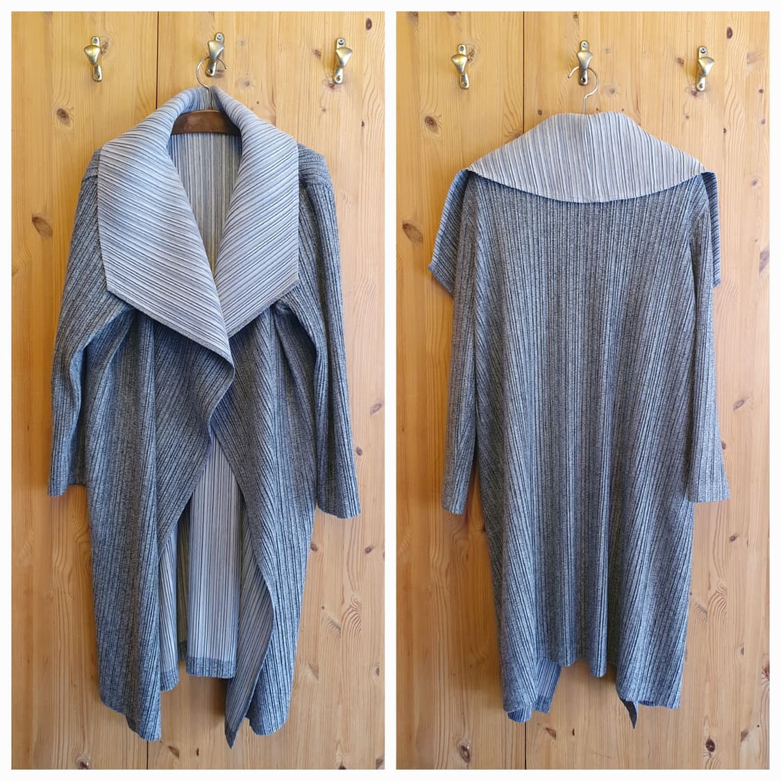 헤비플리츠 오픈코트 멋스러운 헤비플리츠 오픈코트입니다 66~88까지 All Free 사이즈 착용하시구요 상태 아주 좋습니다 사이즈66~88 . 소재 폴리 . 색상 그레이투톤 가슴반품free . 총기장100