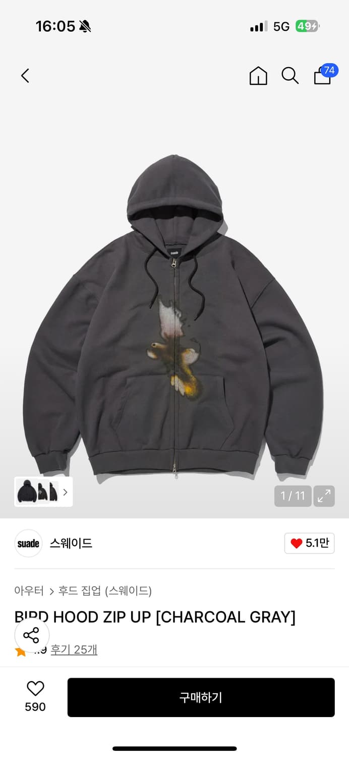 (유튜버 니들 픽) 스웨이드 suade 버드 후드집업 (차콜 그레이)