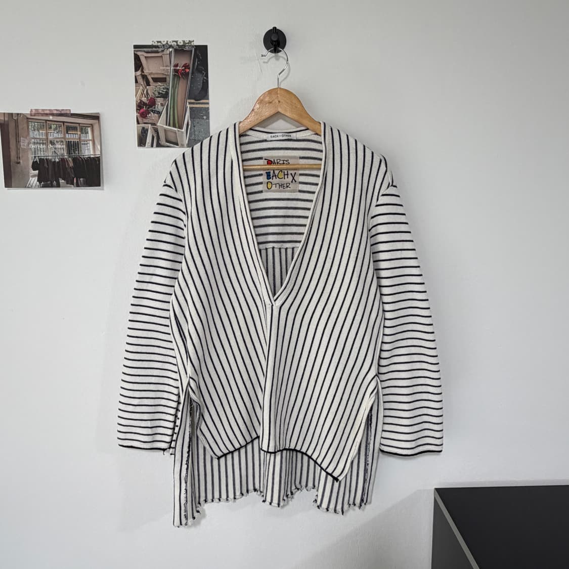 - [F] EACH & OTHER 스트라이프 브이넥 가디건 - 표기사이즈 : FREE - 실측사이즈 : 가슴 54 / 소매 57 / 어깨 49 / 총장 75 - 컨디션 : A