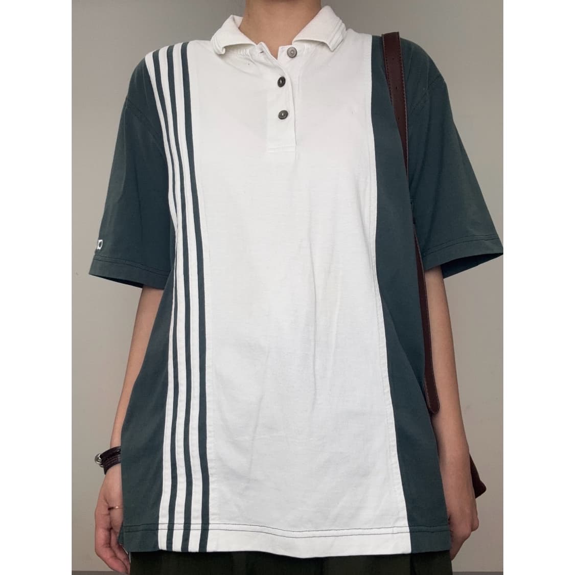 brand adidas fabric(%) 면60 폴리에스터40 size(cm) 표기L 어깨50 가슴56 총장69 소매26 암홀25 - 딥그린&화이트 컬러 배색과 유니크한 삼선 배치가 돋보이는 아디다스 폴로 셔츠 - 한쪽 소매 끝 부분의 아디다스 로고 자수 디테일 - 여유 있는 사이즈 model 170cm 55size / 5만 원 이상 구매 시 무료배송