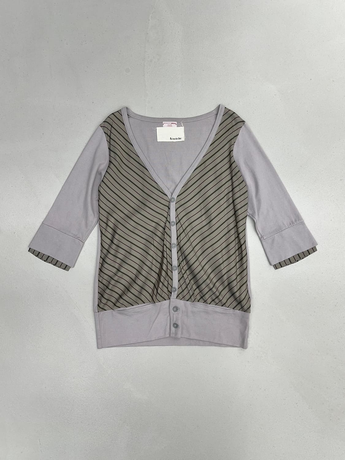 어깨38 가슴46 팔41 총장62(cm) REDESIGN UNIT bikini 가디건 입니다. 코튼 소재이며 사선 라인의 원단이 믹스된 디자인이 돋보이네요. 사이즈는 실측을 참고해 주세요!