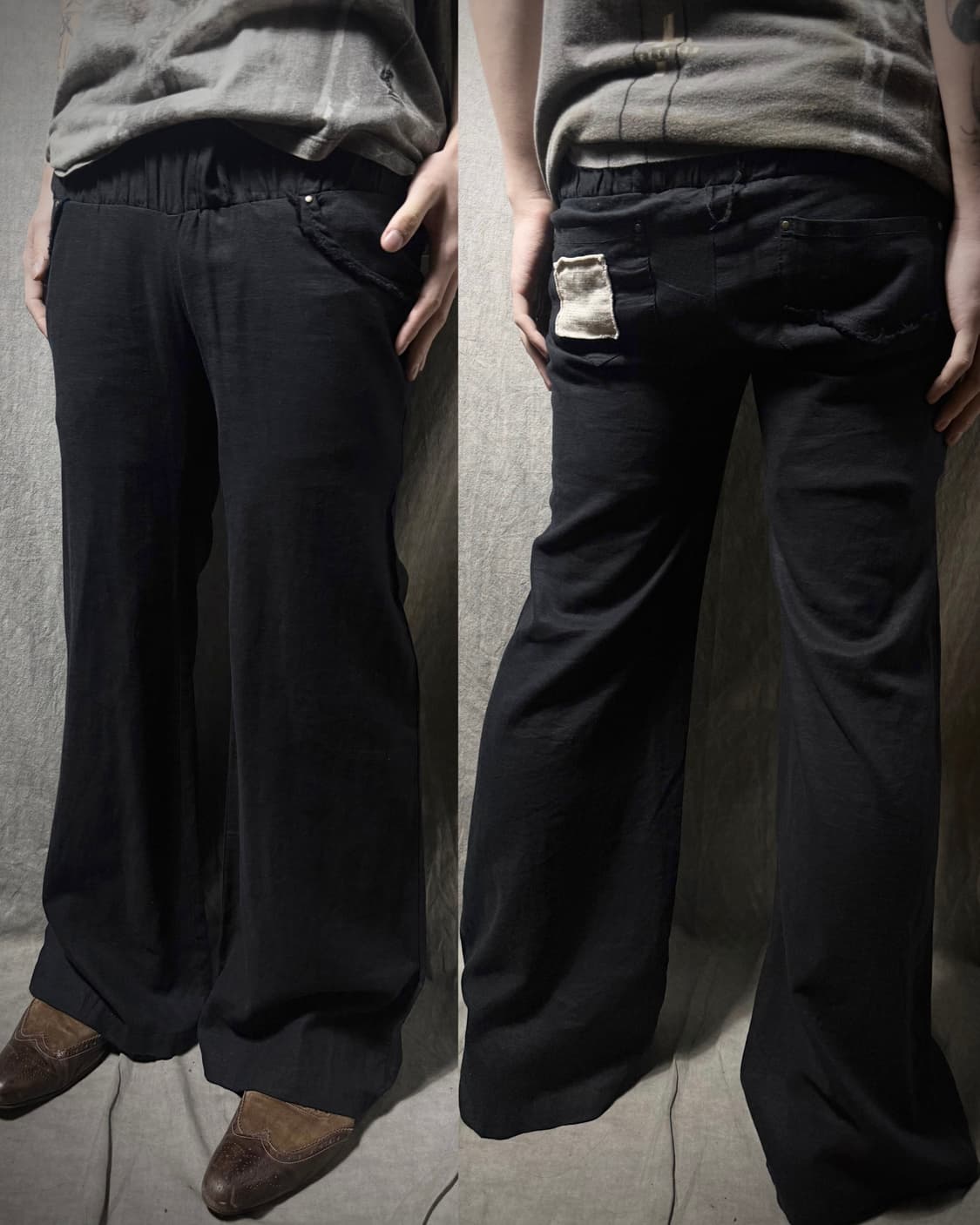 GOA Smocked Waist Linen Blend Bootcut Pants 일본의 노마드 미학과 빈티지 아카이브를 기반으로 자유로운 실루엣과 실험적인 소재 가공을 전개하는 레이블입니다. 린넨 55%와 레이온 45% 혼방 소재의 부츠컷 팬츠입니다. 허리 라인의 정교한 스모킹 셔링과 포켓 입구의 컷오프 디테일이 특징입니다. 후면 포켓에 브랜드 시그니처 패브릭 라벨이 부착되었으며 소재 특유의 유연한 드레이프를 통해 하단으로 넓게 퍼지는 입체적인 플레어 실루엣을 구현합니다. Condition: A Free Size Waist: 38/ Thigh: 27/ Hem: 32/ Length:99(cm) Fabric: Linen,Layon