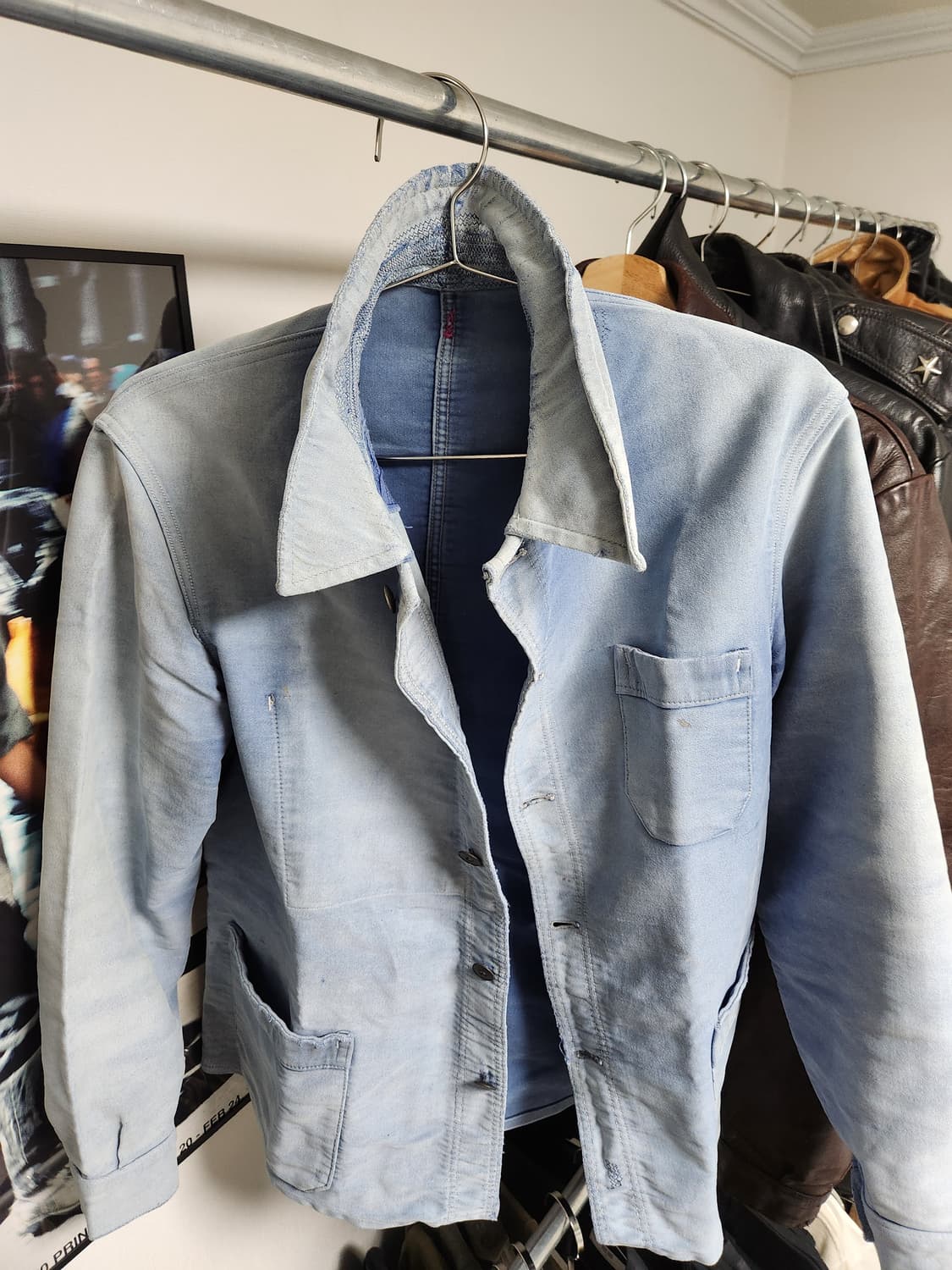 50s French Moleskin  Le Populaire Qualité Chore Jacket Shoulder : 47cm Chest : 55cm Arm : 58cm Length : 66cm 전반적으로 사용감이 있으나 몰스킨 원단에 선페이딩이 너무 멋진 제품입니다
