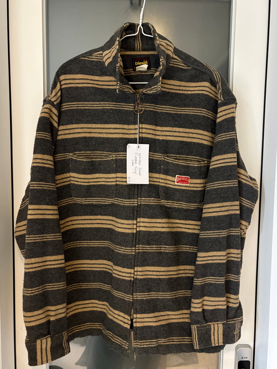 디젤 빈티지 스타일의 집업 자켓입니다. 런던에서 빈티지샵에서 구매한 제품이에요! 톤 다운된 색감의 가로 스트라이프 패턴이 멋스러워요. 빈티지한 무드를 좋아하시는 분들께 추천드립니다. 별도 문의 없으시면 바로 안전결제 부탁드려요! 총장 :77cm