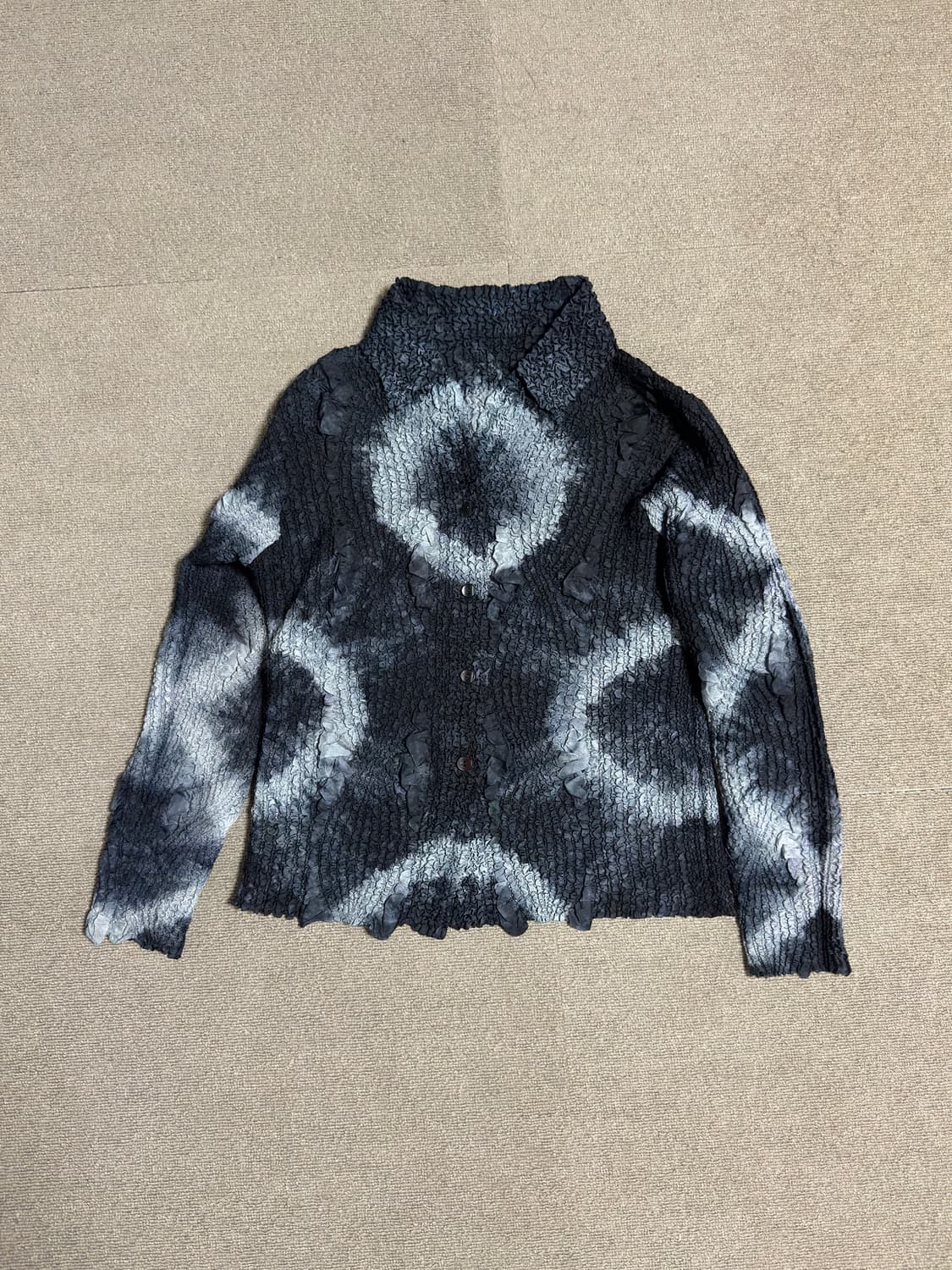 블랙 & 그레이 톤의 고급스러운 타이다이 패턴이 들어간 플리츠 셔츠입니다. 원단 전체에 촘촘하게 입체적인 플리츠가 잡혀 있어 체형에 관계없이 아주 편하게 늘어납니다. 전면 단추형으로 셔츠처럼 입거나 가볍게 아우터로 걸치기 좋습니다 굉장히 가볍고 바스락거리는 질감이라 몸에 달라붙지 않아 쾌적합니다. 단추가 4개뿐이라 넥라인이 길게 보이는 시원한 디자인입니다. 야외활동 시 또는 락페 등 가볍고 간편하게 걸칠 수 있는 제품입니다!