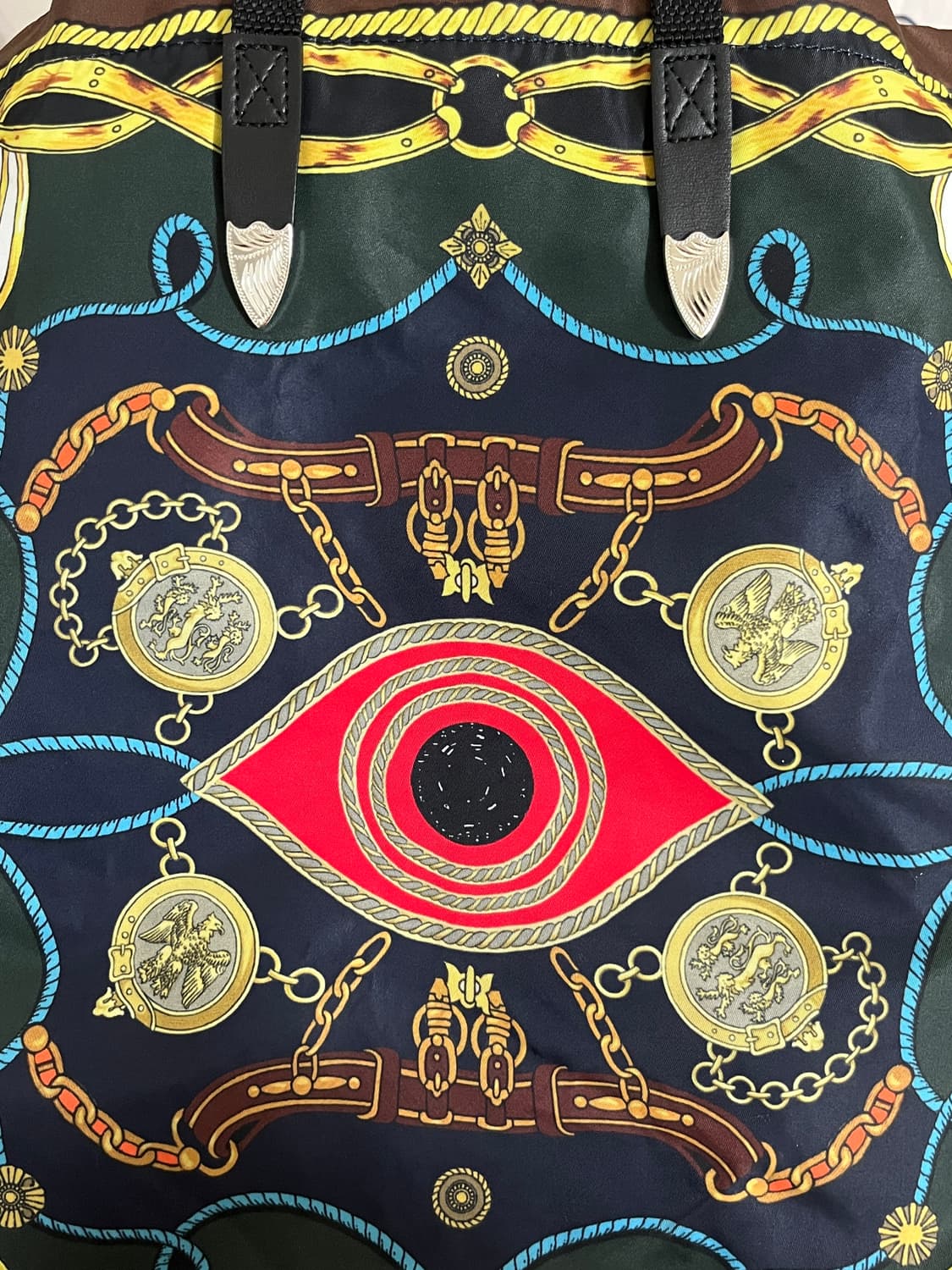 Toga too 프린트 토트백입니다 긴 끈으로 크로스도 가능합니다 내부 오염과 크로스 가능한 끈 연결고리 살짝 벗겨짐 있습니다 마지막 사진 세 장 확인해주세요 추가 문의 있으시면 메세지 남겨주세요 반품, 환불X