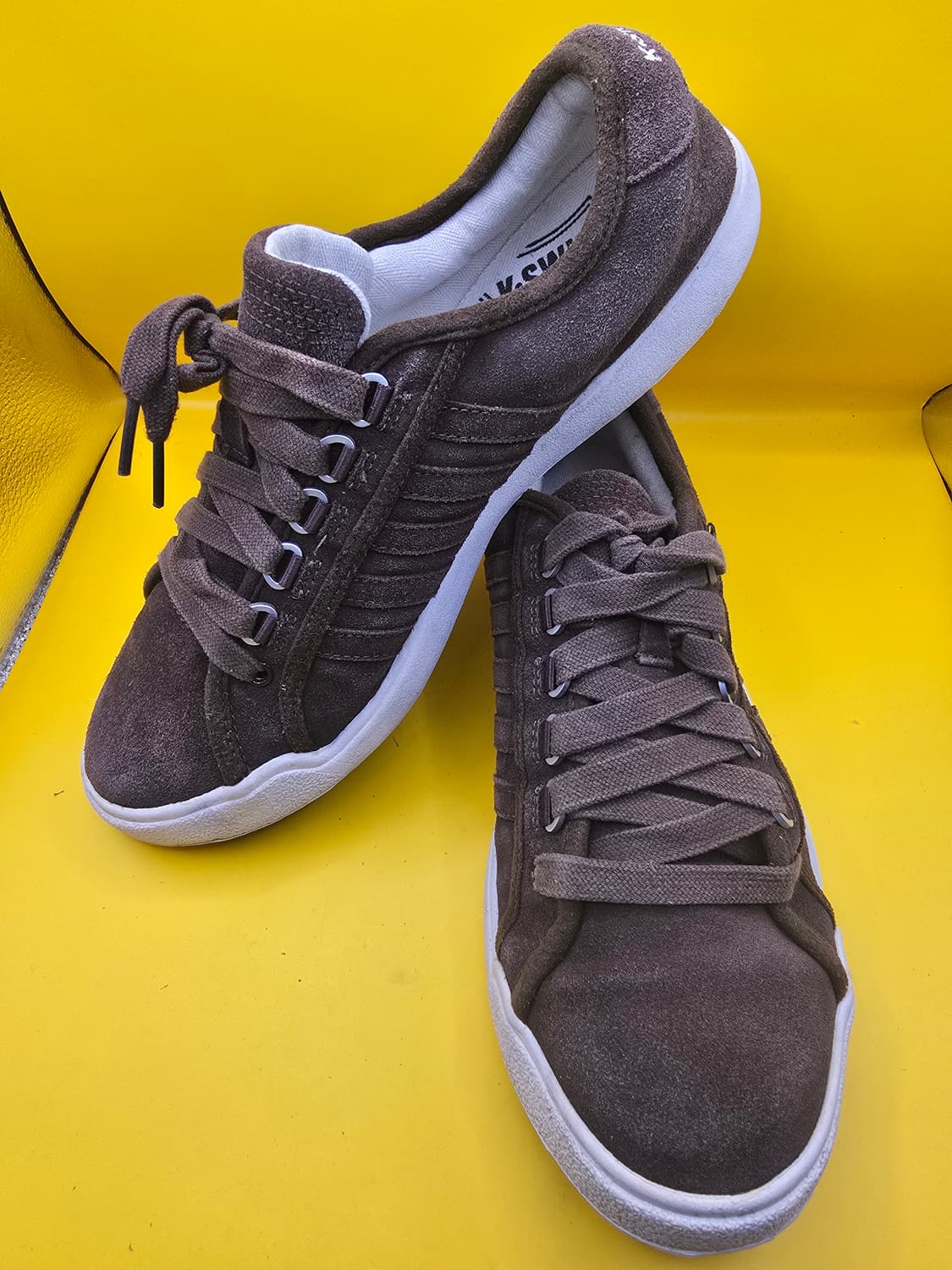 케이스위스 스웨이드 운동화 270사이즈입니다 브라운 컬러라 코디하기 좋고 가볍고 편하게 신기 좋은 데일리용입니다 스웨이드 특성상 사용감은 있으나 밑창 상태 괜찮아 실착 문제 없습니다 ✔ 사이즈 270 ✔ 가벼운 착용감 ✔ 반품 환불 불가
