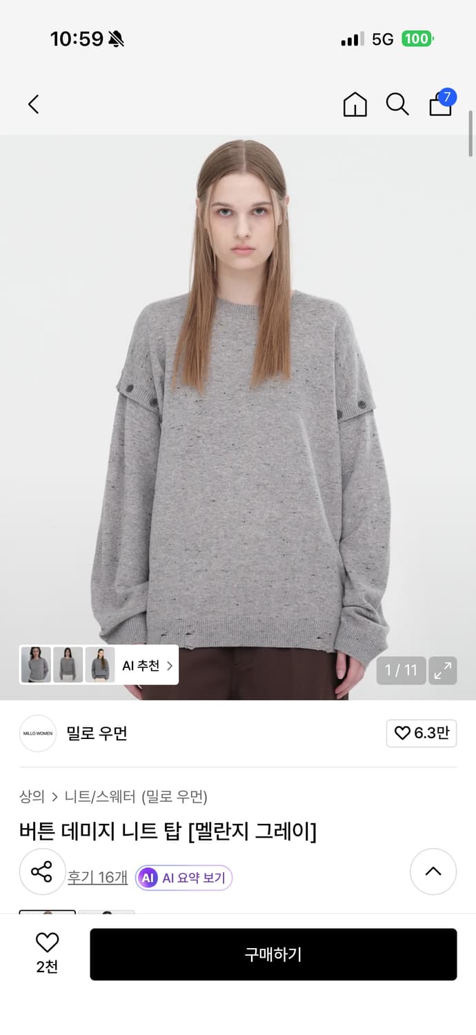 버튼 데미지 니트 탑 [멜란지 그레이] 실착2 정가-118000