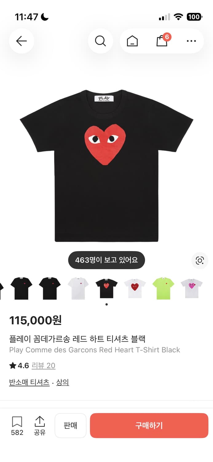 꼼데가르송 블랙 하트 반팔티 xs
