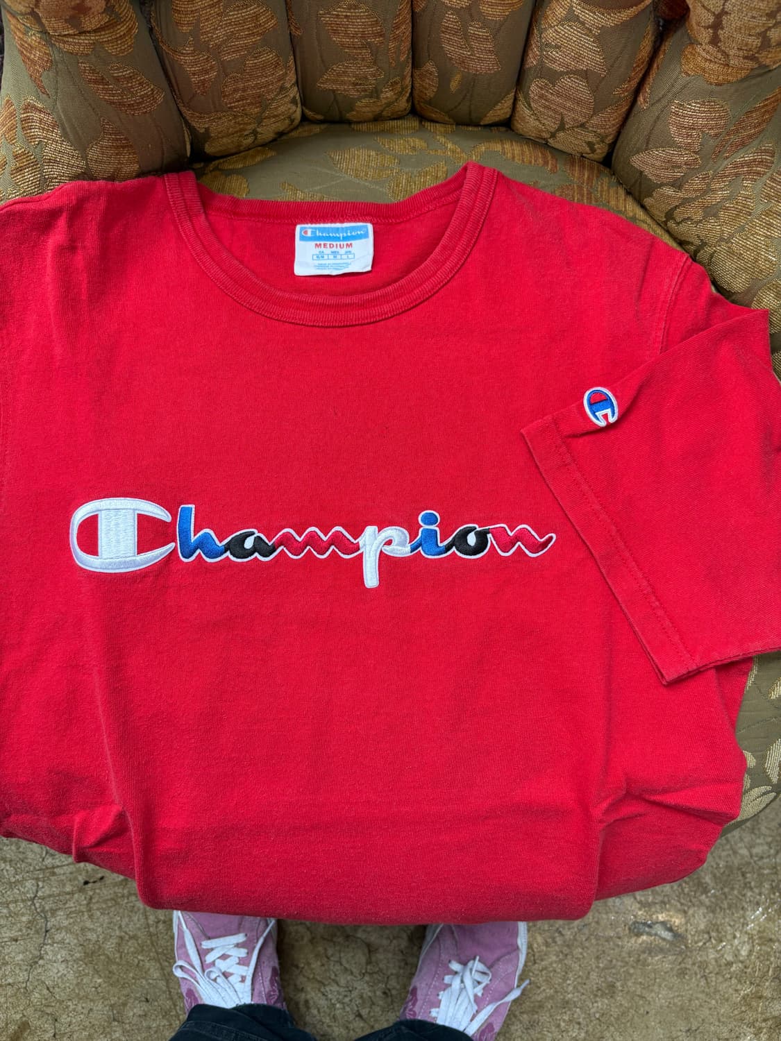 챔피온 자수 반팔 티셔츠 - 쨍한 레드 컬러 챔피온 로고 자수 - 탄탄한 넥라인과 원단감 ▪️Size : M 어깨 43 가슴 49 기장 69