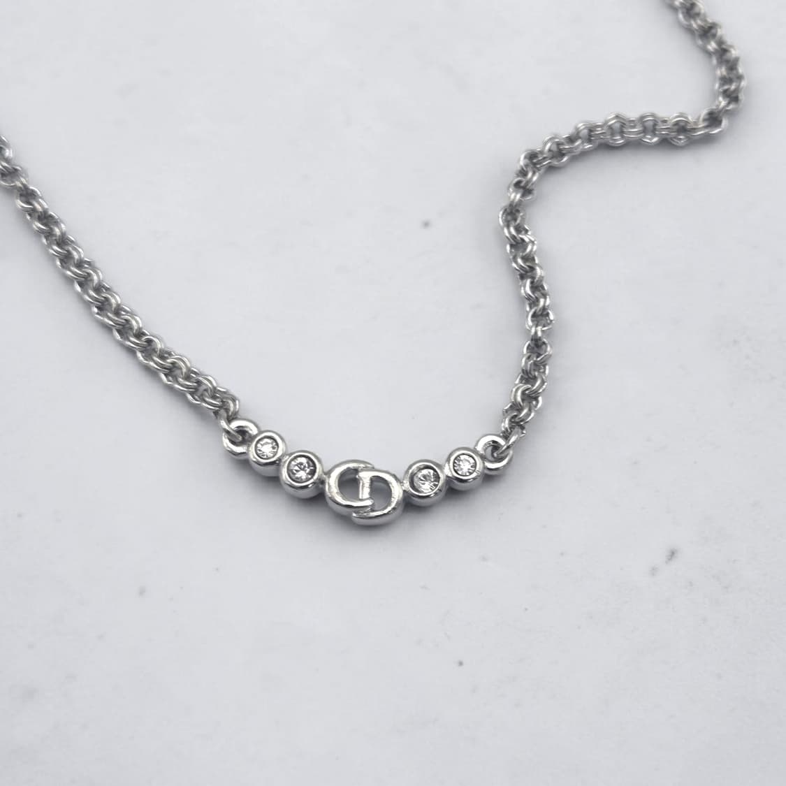 체인 : 36cm ~ 41cm 소재: 브라스 화이트골드 도금 구성: 목걸이 단품 컨디션: 양호 CD 로고 양옆으로 큐빅이 장식되어있는 유니크한 디자인 입니다 화이트 골드 도금을 입혀주었습니다 포인트 아이템으로 추천드려요