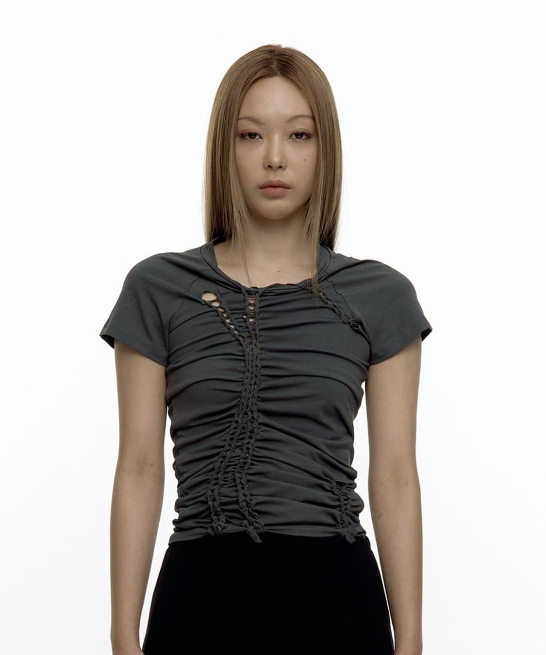 플리즈노팔로우 리본 포인트 레이스 카모 반팔 티셔츠