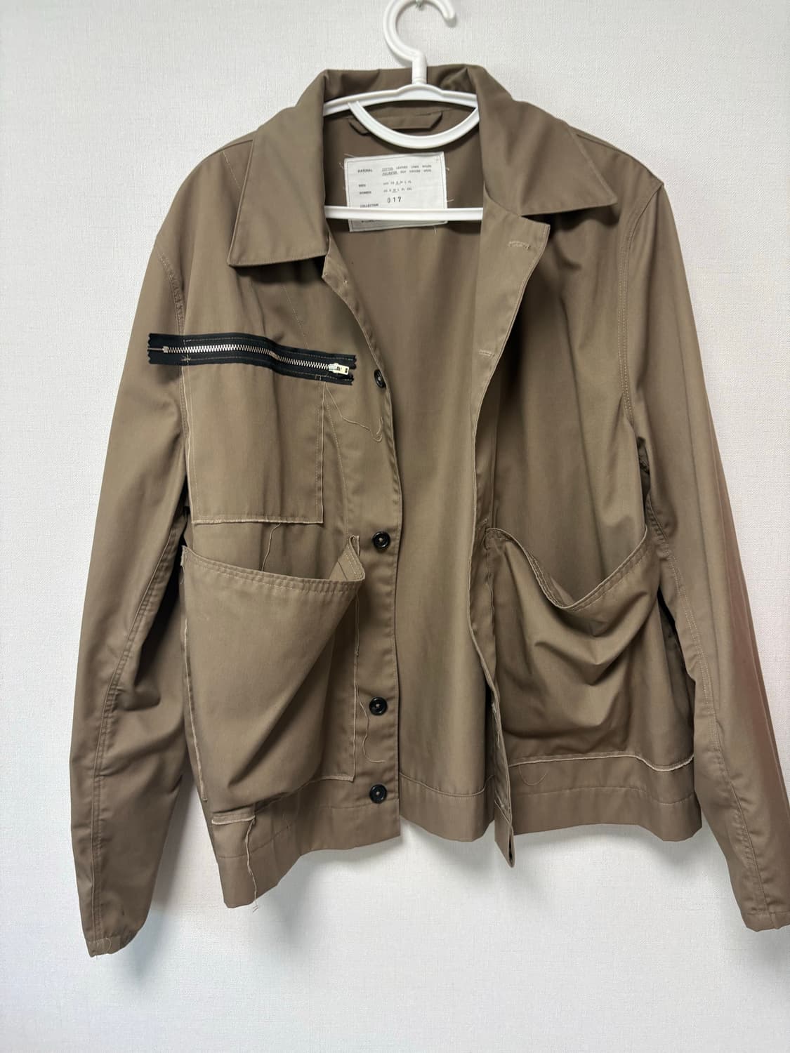 얇은 간절기용 자켓 하자 없고 디테일이 매력적인 옷입니다 사이즈는 s로 표기 되어있는데 오버사이즈라 100사이즈인거 같습니다