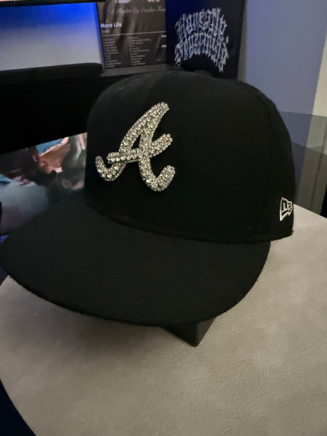 블랙 색상의 뉴에라 59FIFTY 애틀란타 브레이브스 볼캡이에요 정면의 A 로고에 큐빅이 반짝여서 포인트가 되어줘요 깔끔한 디자인으로 어떤 옷에도 잘 어울릴 거예요ㅕ