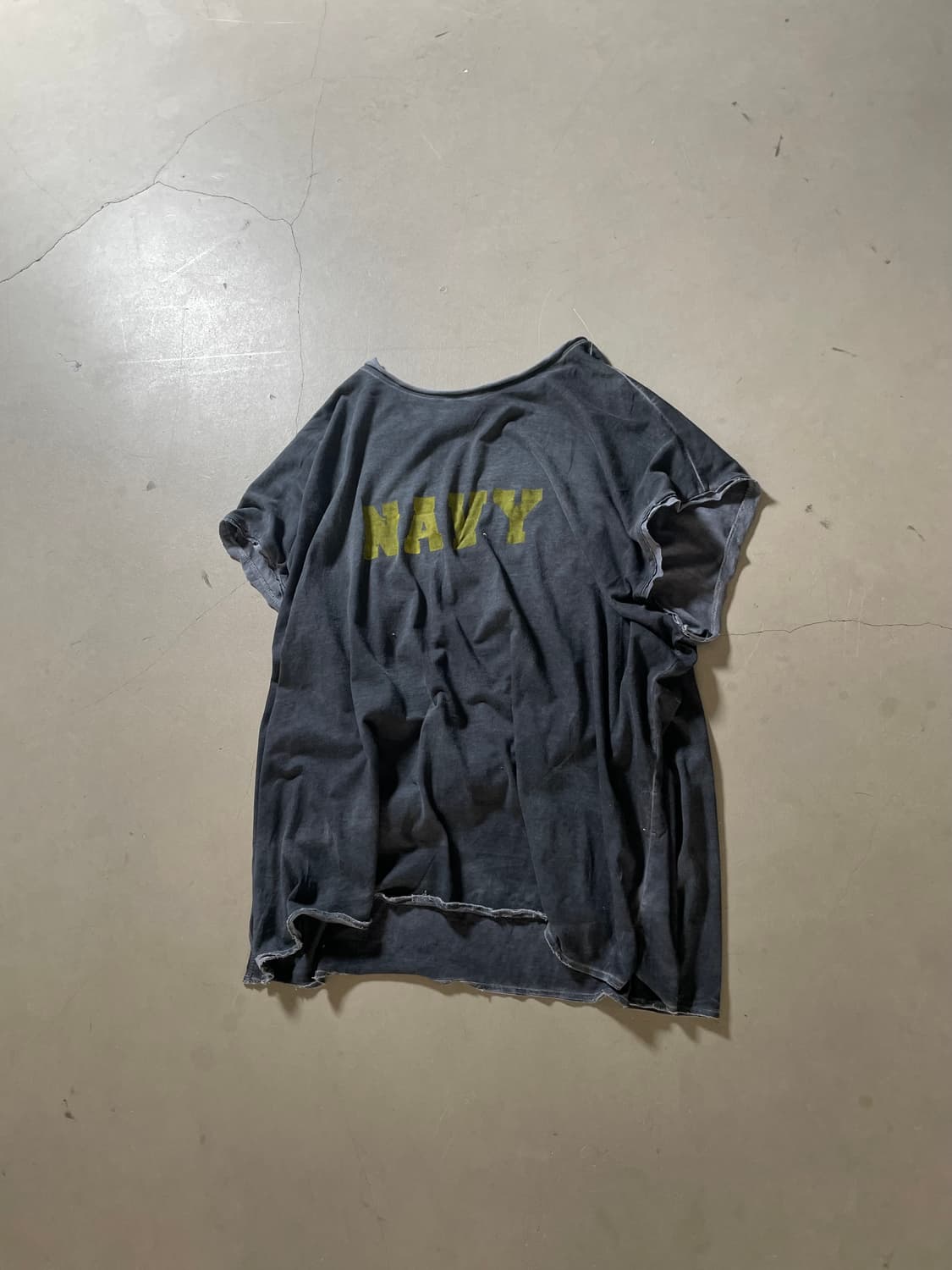 Product Info • Brand : KZ Atelier • Item : NAVY Tee • Color : Charcoal • Size : OS • Measurements : 품 71cm / 총장 74cm • Fabric : Cotton • Condition : 자연스러운 페이딩 및 데미지 ⸻ Description KZ 아틀리에에서 제작한 커스텀 빈티지 티셔츠입니다. 네이비 프린팅과 자연스러운 페이딩, 컷오프 디테일이 특징이며 루즈한 실루엣으로 편안하게 착용 가능한 제품입니다