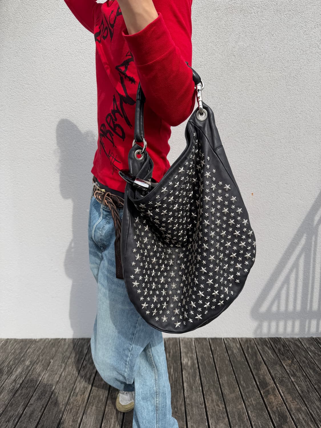 런던 기반의 럭셔리 브랜드로, 글램한 디자인과 하드웨어 디테일 중심의 가방·슈즈 라인으로 알려진 하우스 지미추 부드러운 양가죽 바디 위에 다양한 크기의 스타 스터드를 촘촘하게 배치한 시그니처 아카이브 모델 유연한 호보 실루엣으로 자연스럽게 떨어지는 드레이프 구조, 스터드와 램스킨 대비로 입체감 있는 표면감 메탈 링 하드웨어 및 로고 각인 디테일, 내부 스웨이드 라이닝 마감 가죽 사용감 및 내부 약간의 이염 존재하지만, 전반적으로 양호한 컨디션 현재 단종된 풀 스터드 라인으로 아카이브 가치 있는 피스